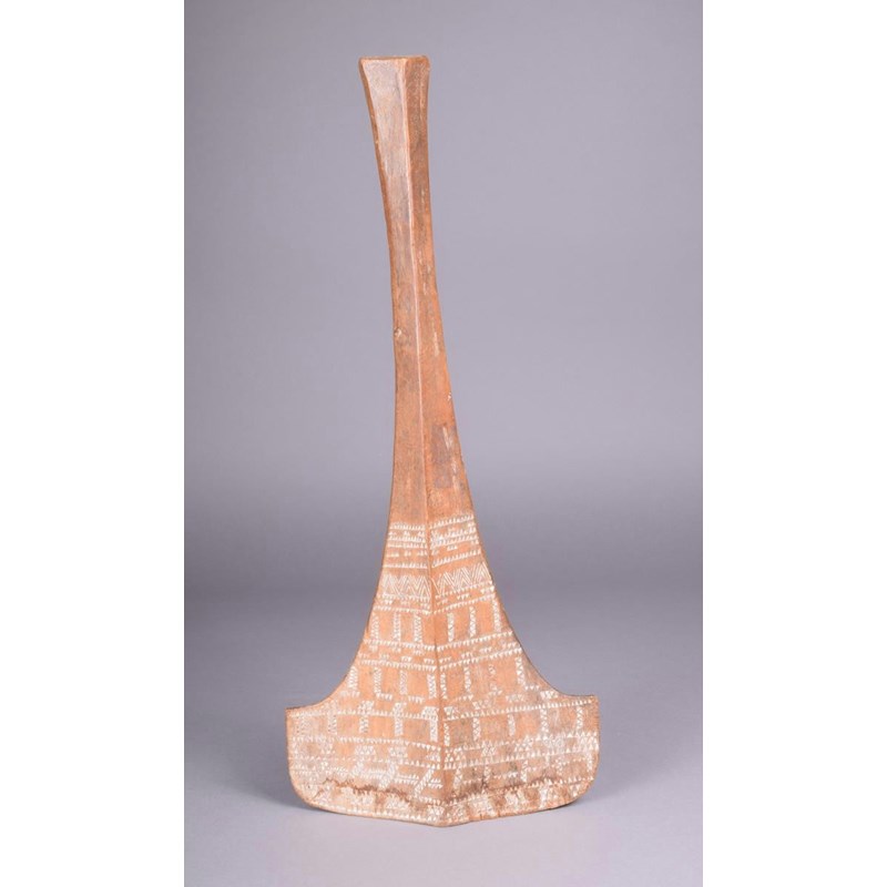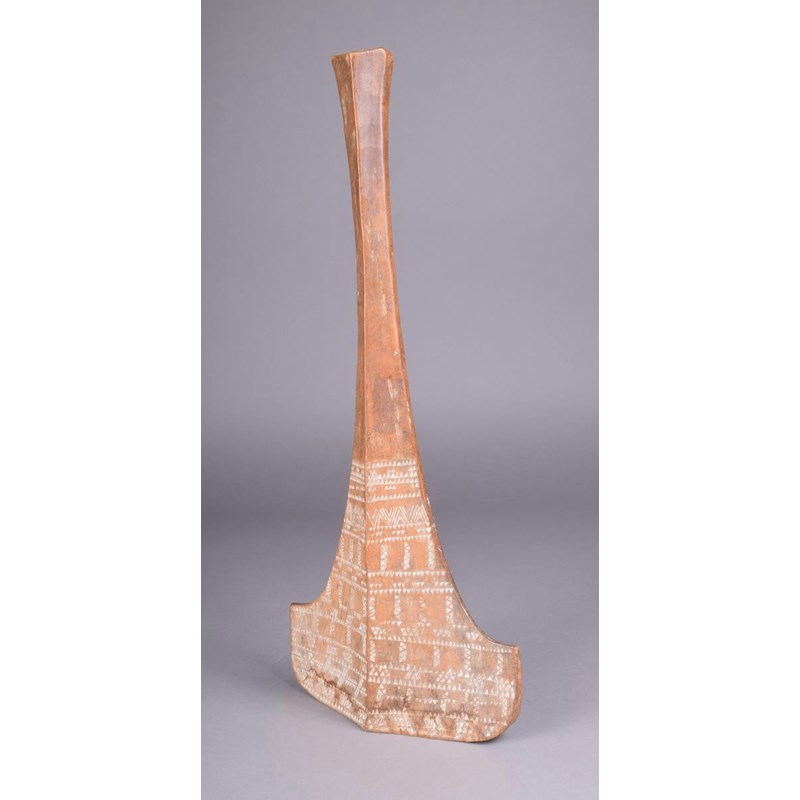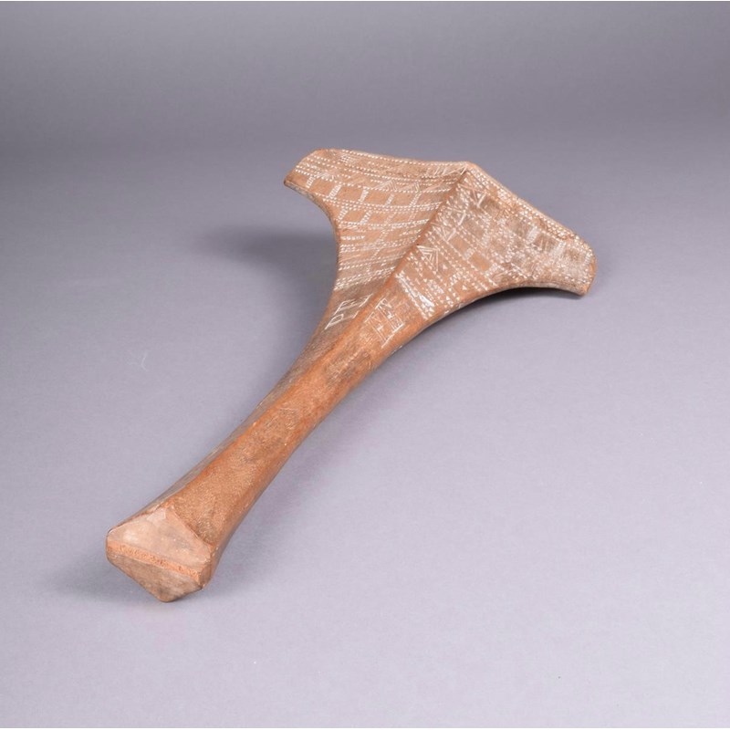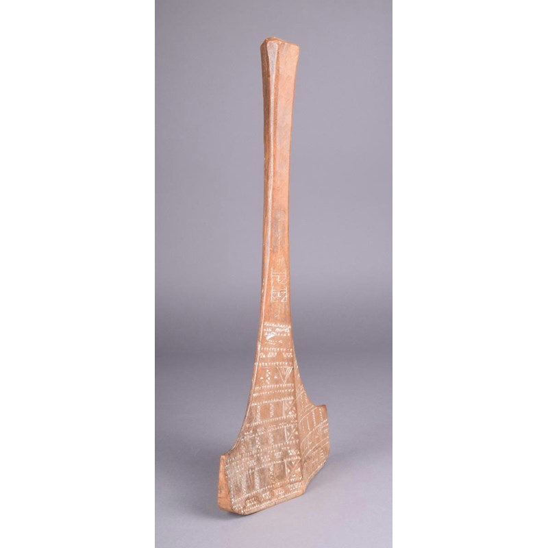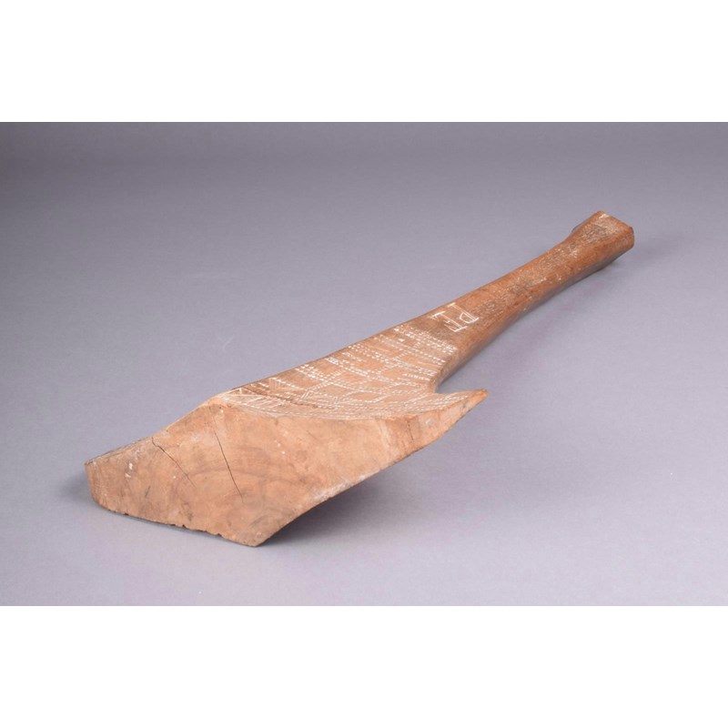 A Samoan club, Polynesia, of faceted hatchet form with incised decoration and initialed PE FE, lime filled, 49cm long.