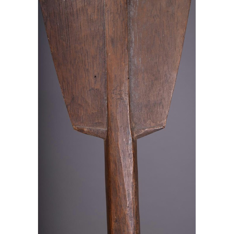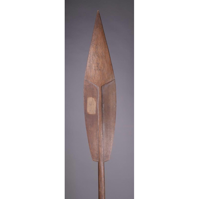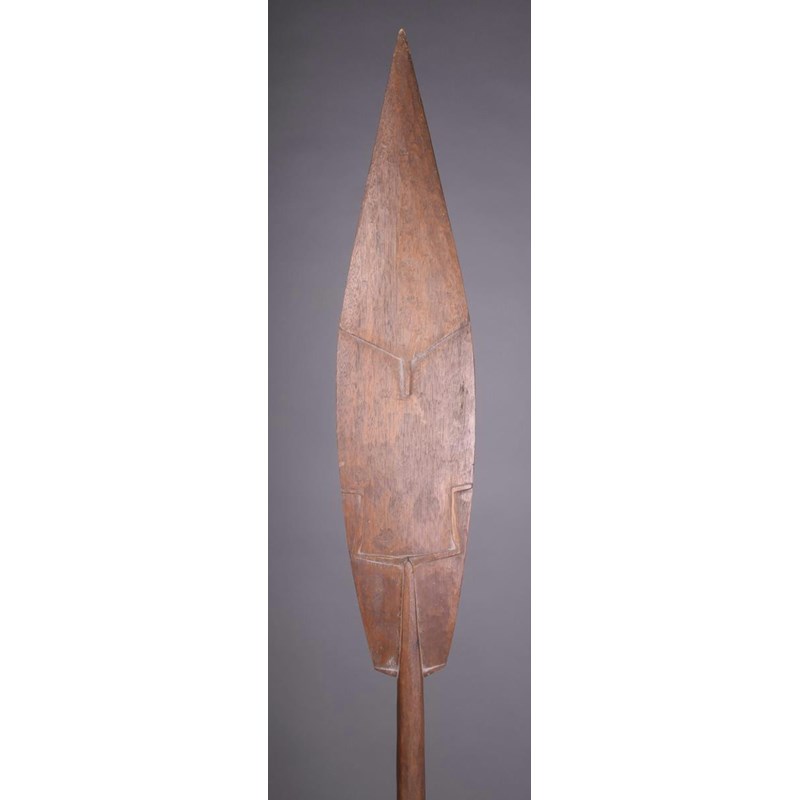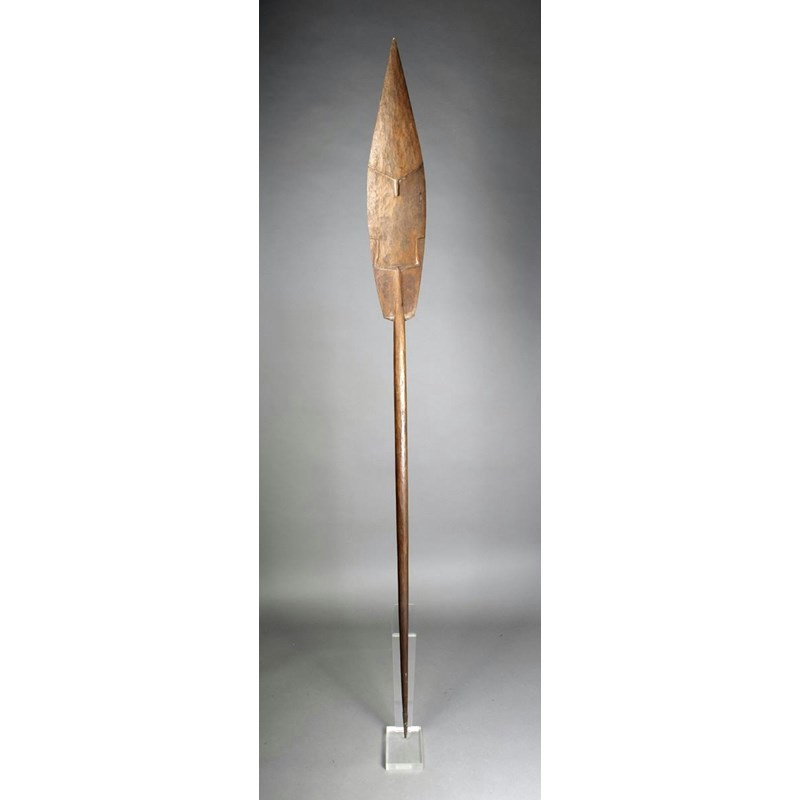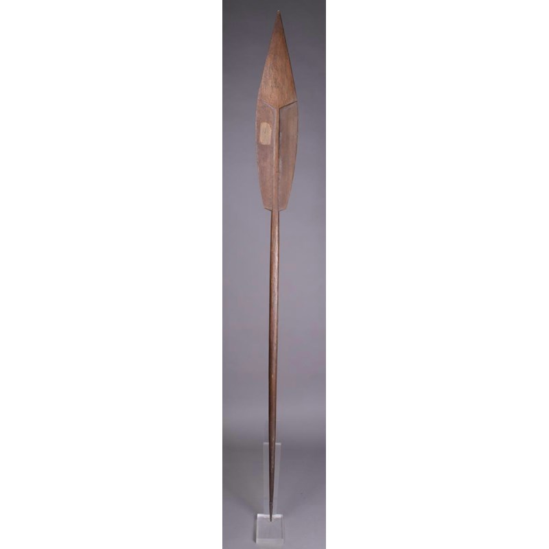 A Papua New Guinea paddle club, Melanesia, with a leaf shape blade with stylised relief carving, with a tapering shaft to a squared point, 180.5cm long.