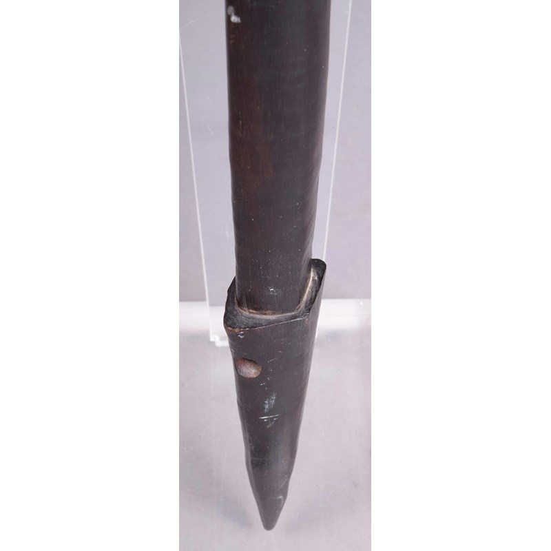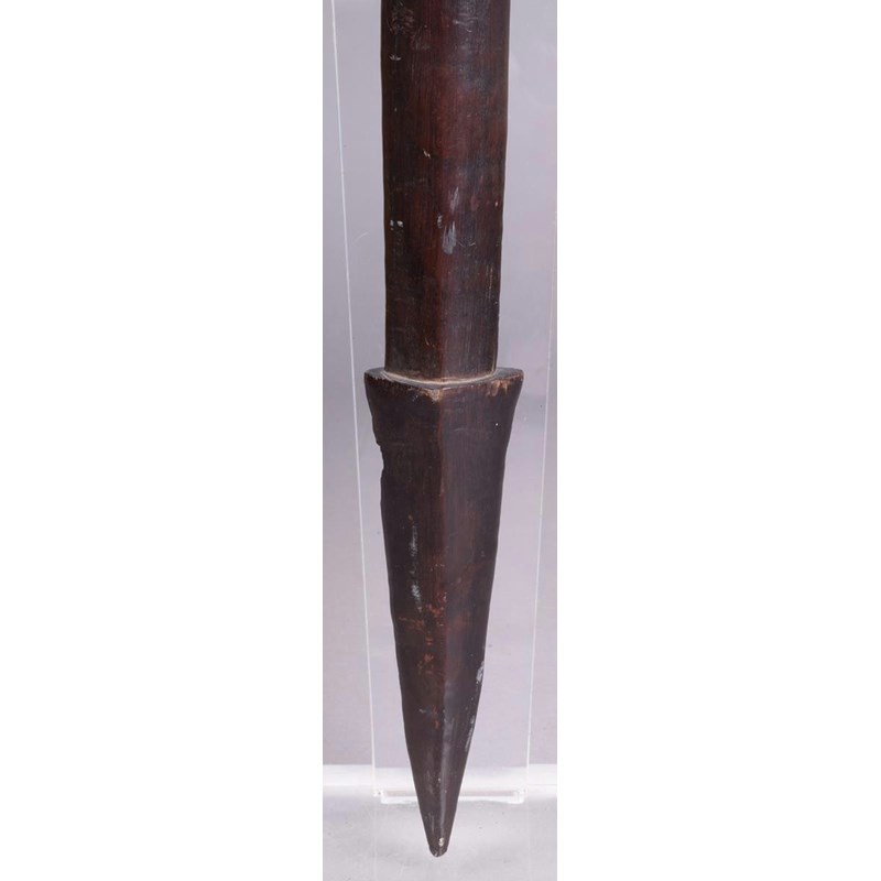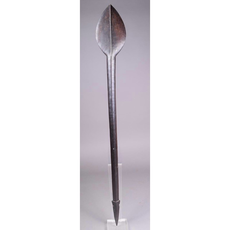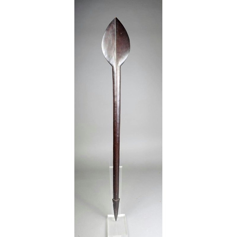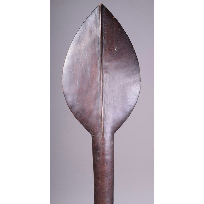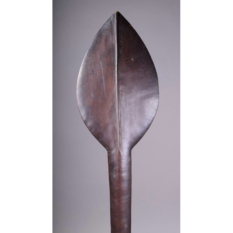 A Solomon Islands paddle club, Melanesia, with a leaf shape blade with medial ridge and eliptical shaft and tapering point, pierced through the sides, 100.5cm long.