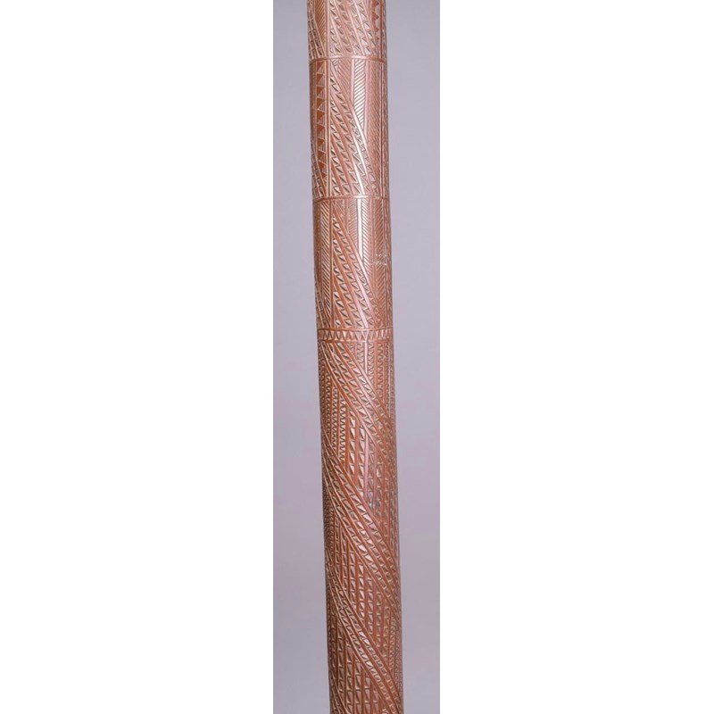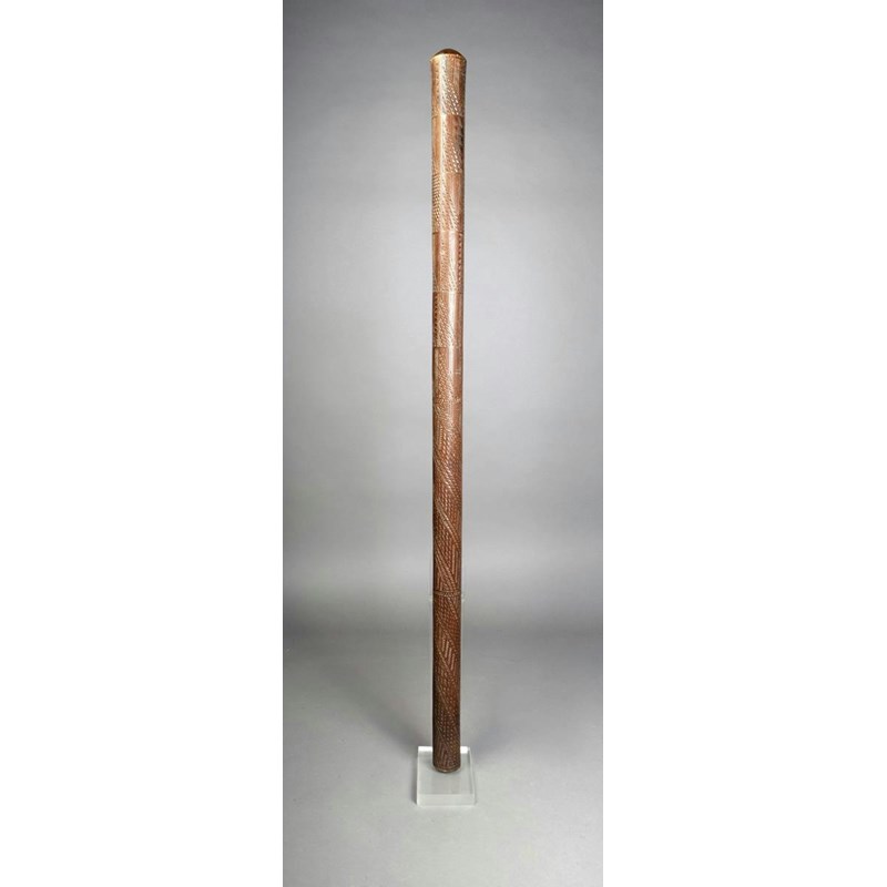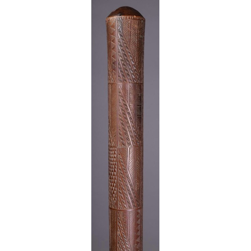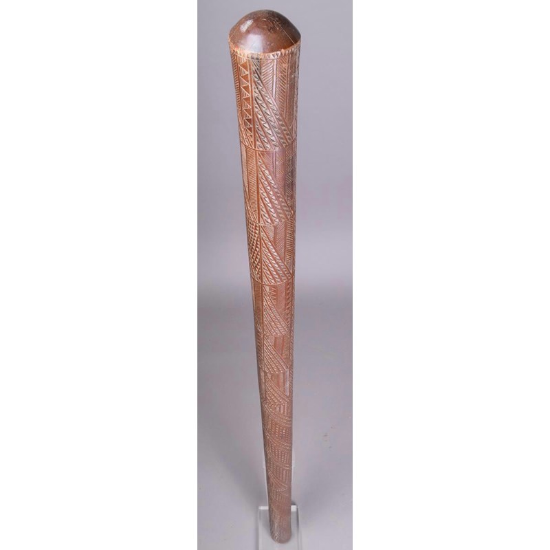 A Tonga pole club, Polynesia, all over carved geometric designs with a domed end, the butt with a shallow circular recess, 124cm long.
