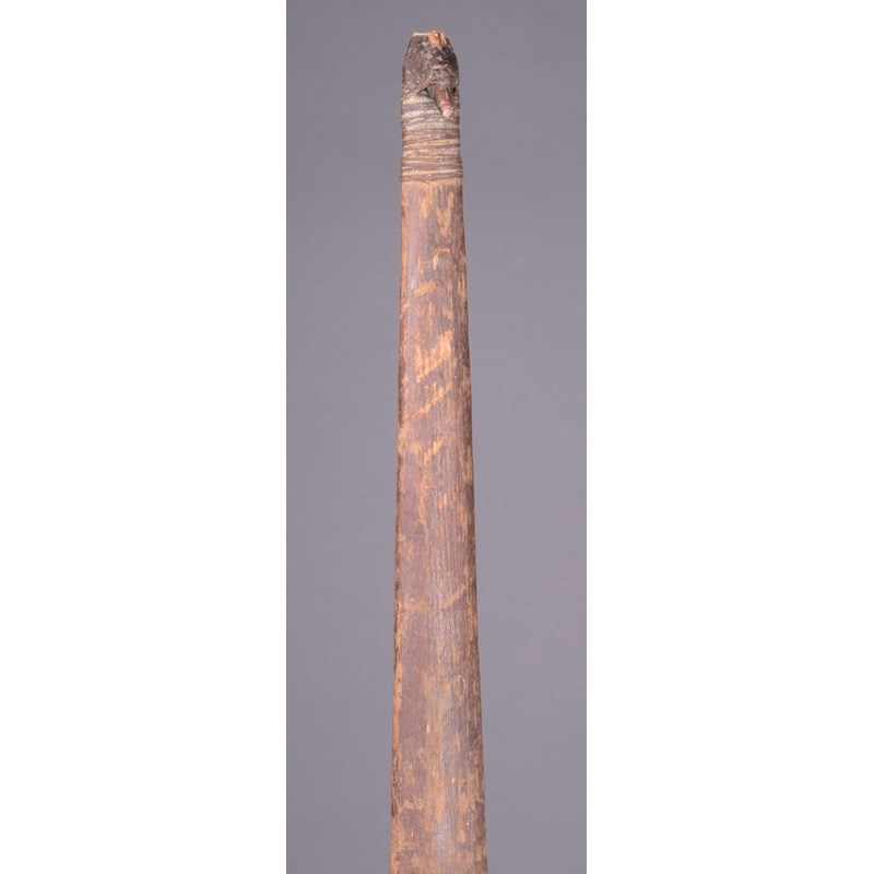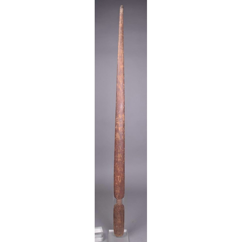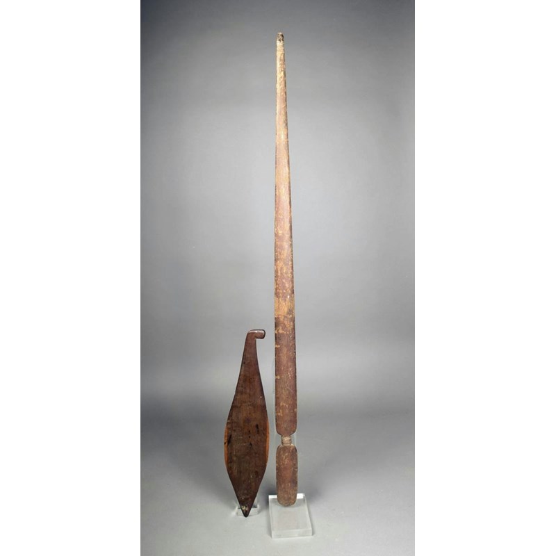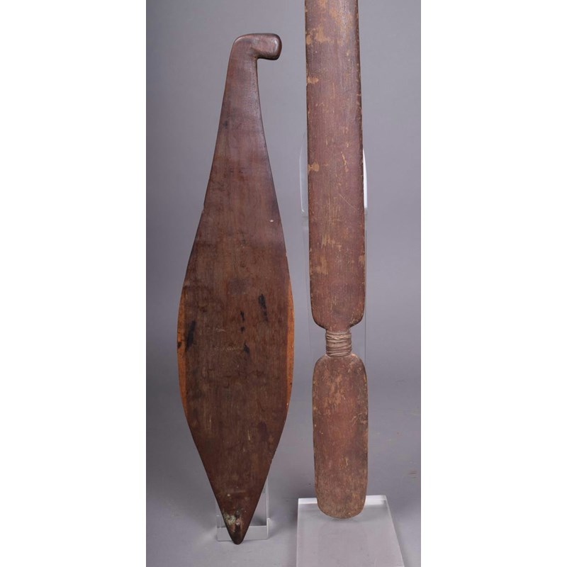 An Aborigine spear thrower, Western Australia, with fibre binding and gum, red ochre finish, 117cm long and an Aborigine woomera, leaf shape with angled terminal, 50cm long. (2)