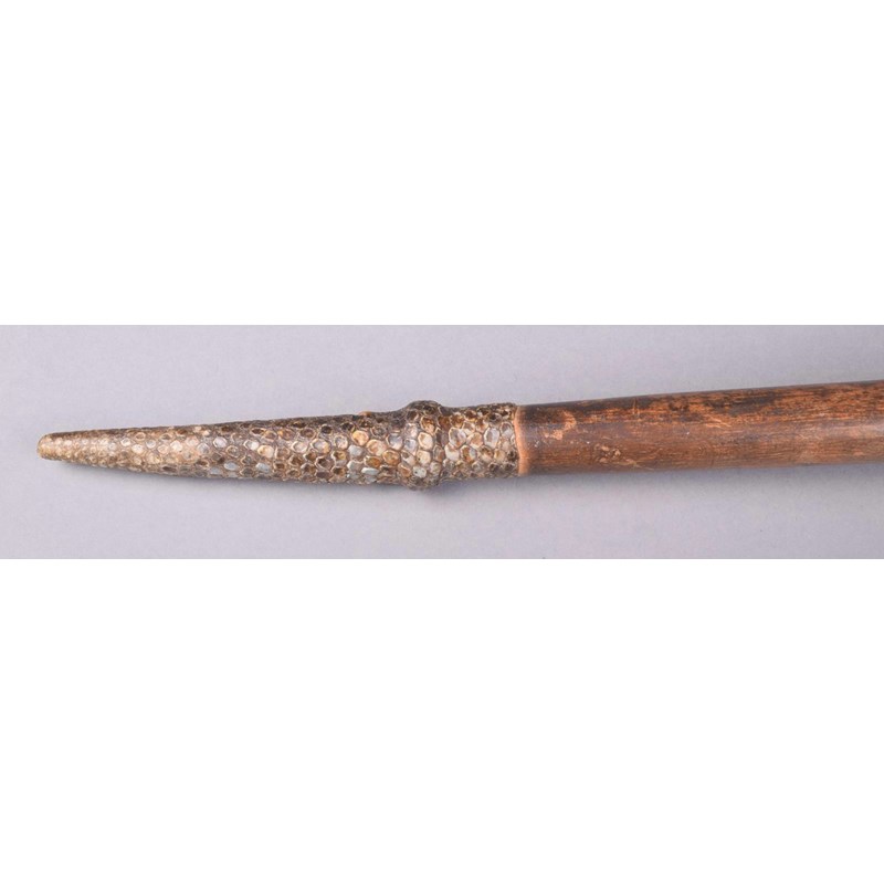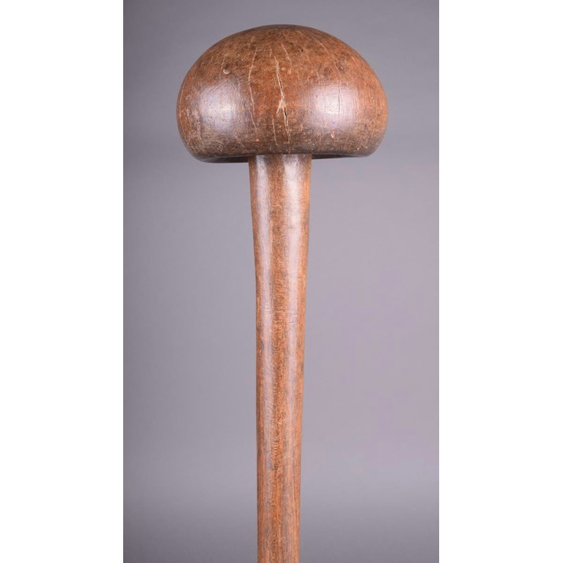 A Dinka knobkerrie, Southern Sudan, with a mushroom shape head, on a tapering shaft with a reptile skin covered handle, 68cm long.