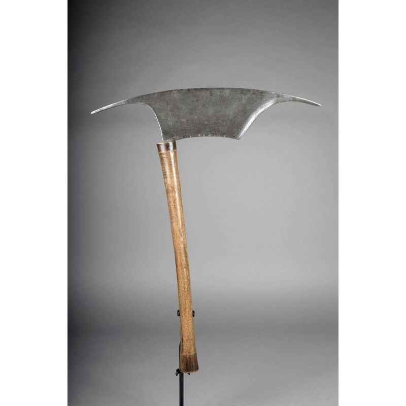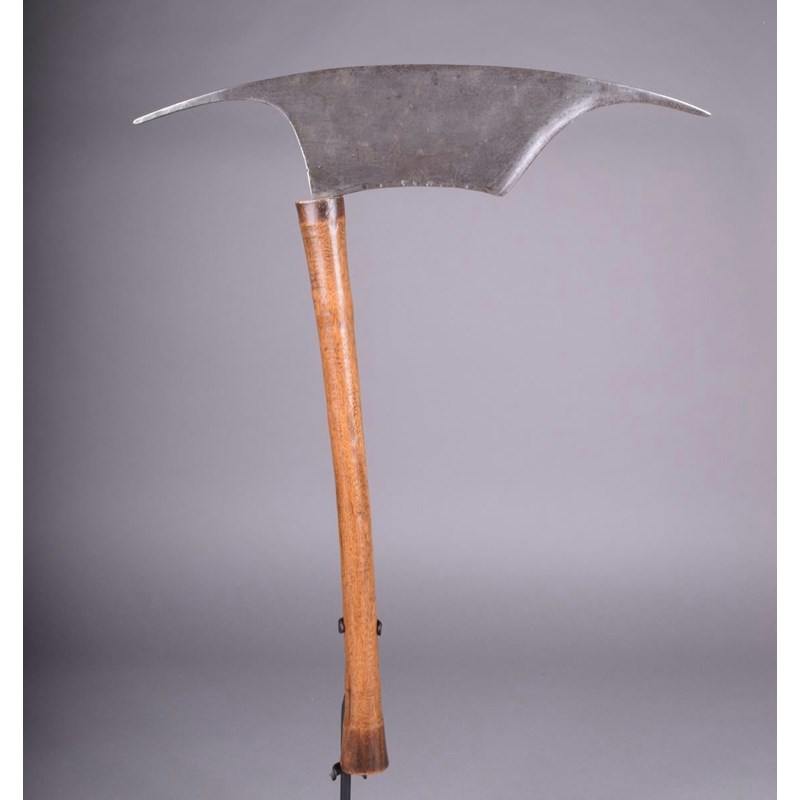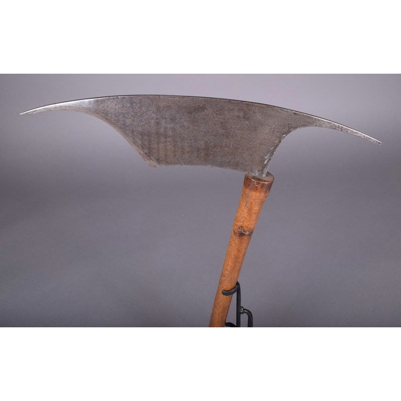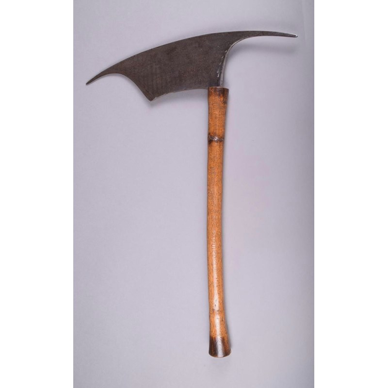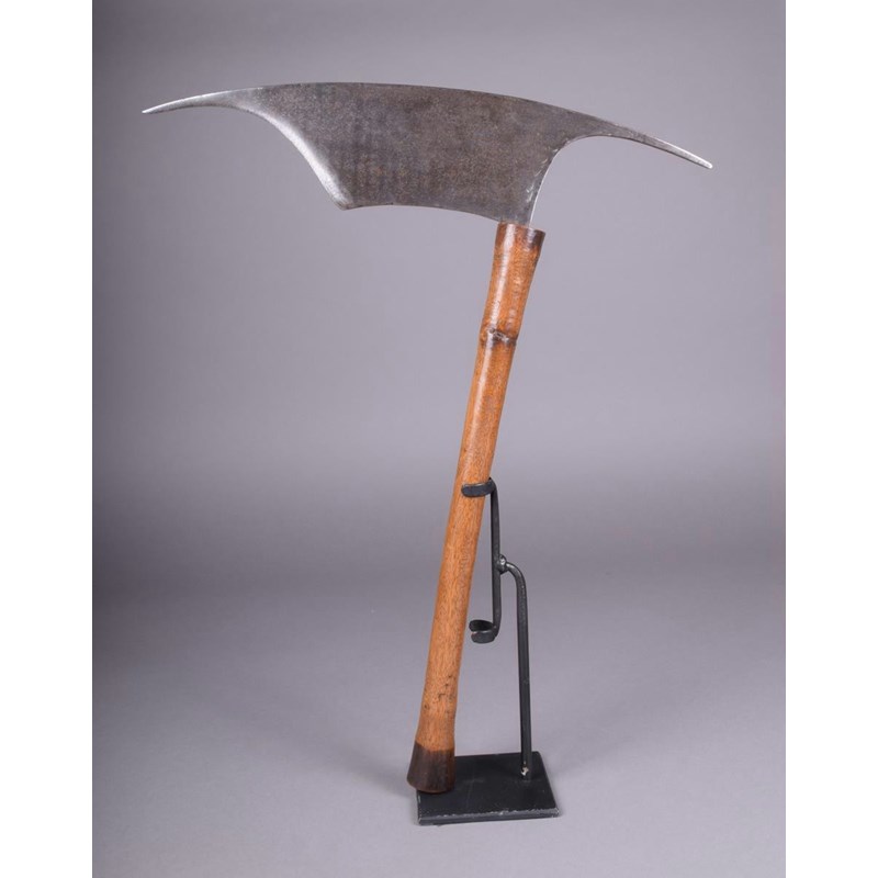 An Igorot axe, Philippines, with distinctive steel blade and a wood handle with stained ends, 50.5cm long.