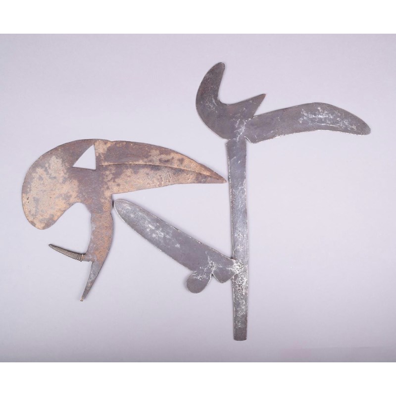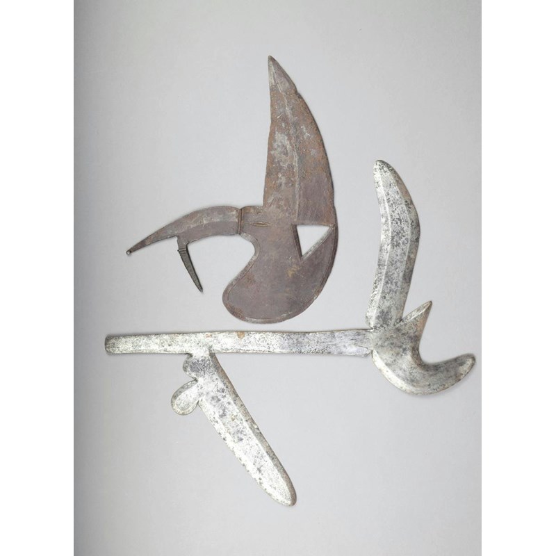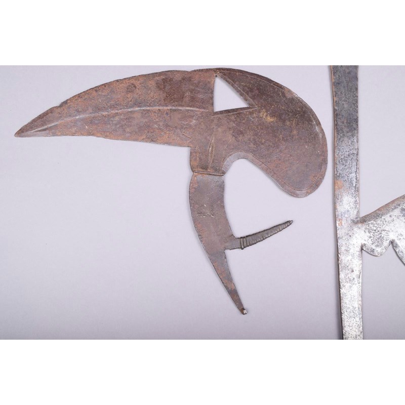 A Kota iron blade, of bird head form with incised decoration, 25cm high and a Congo throwing knife, 44cm high. (2)