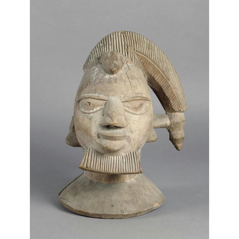 A Yoruba carved head, Nigeria, with a grooved coiffure and beard, the back with a jackal mask, 32.5cm high.