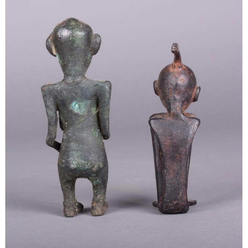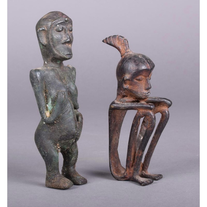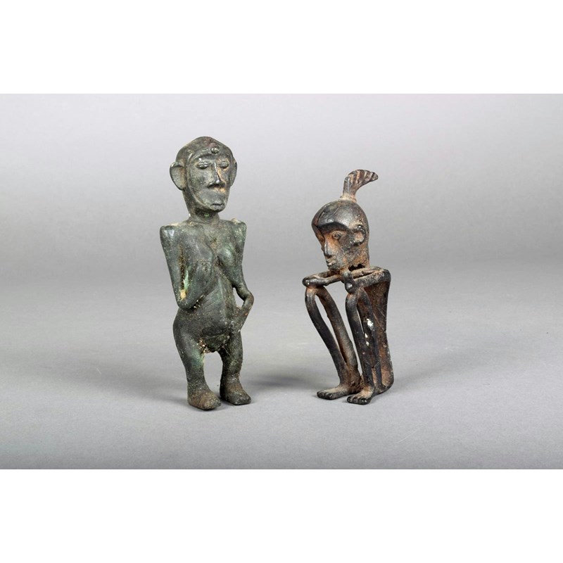 An African bronze standing female figure, with right hand on her breast, 13.5cm high and a seated bronze figure, 11.5cm high. (2)