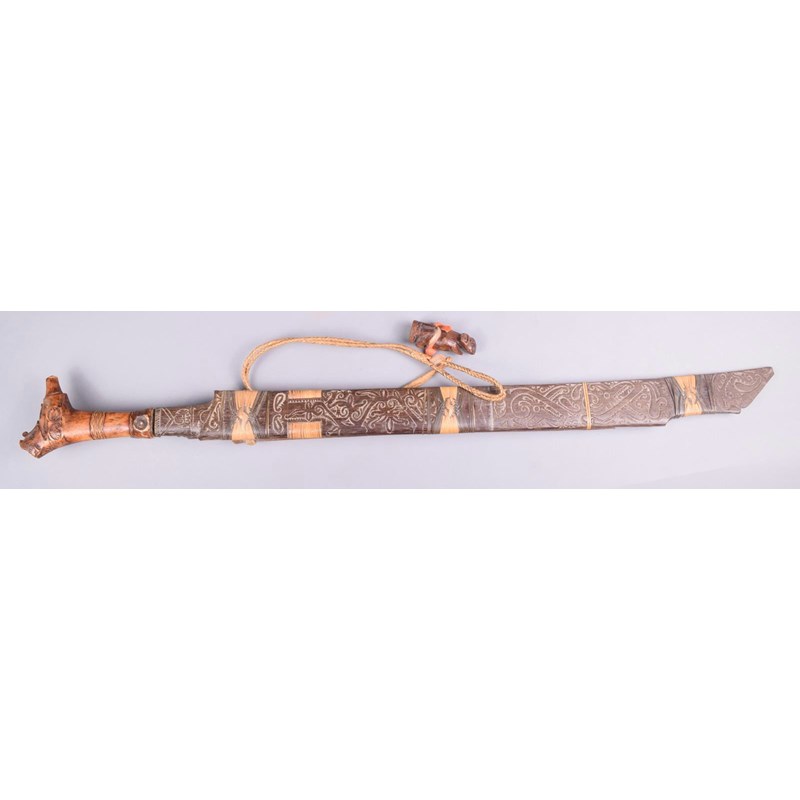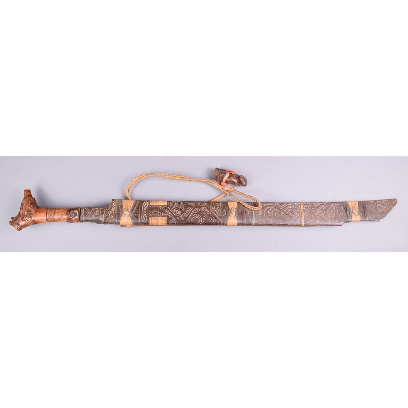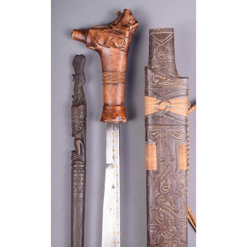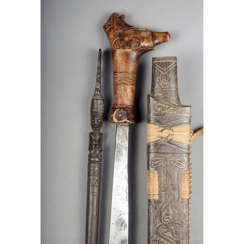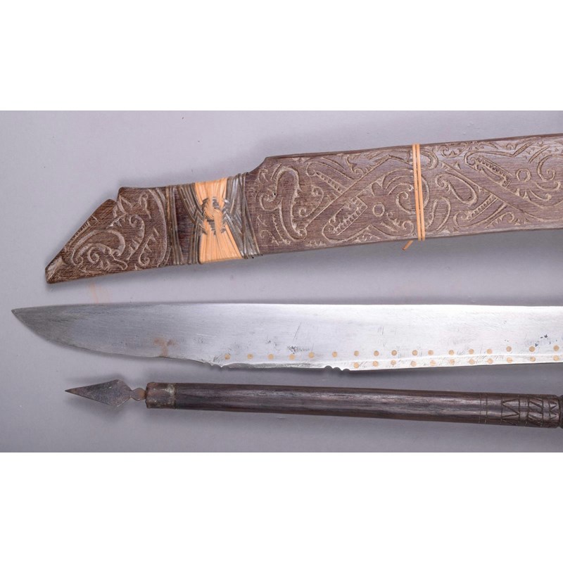 An Indonesian madau, notched steel blade with inset gilt circles, with a carved bone handle and a carved wooden scabbard and a further attached scabbard with short spear having a carved ancestor handle, 89cm long.