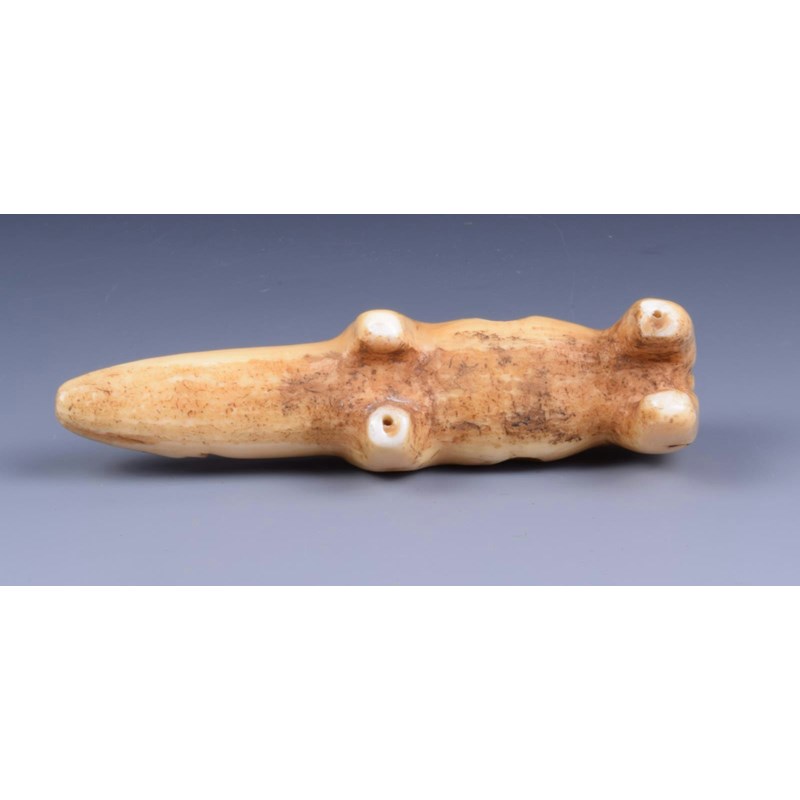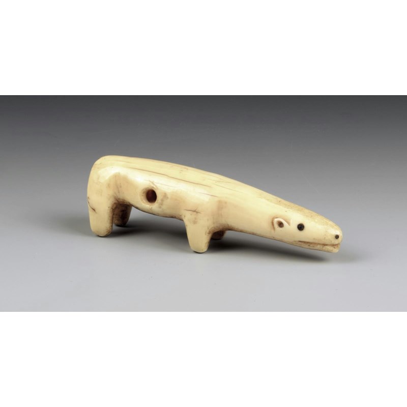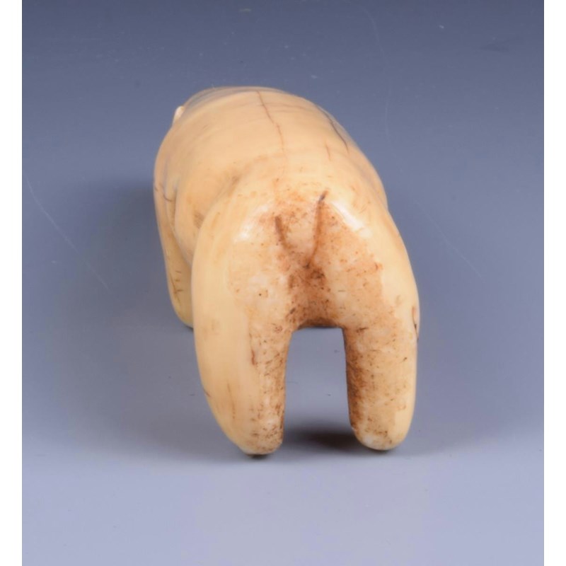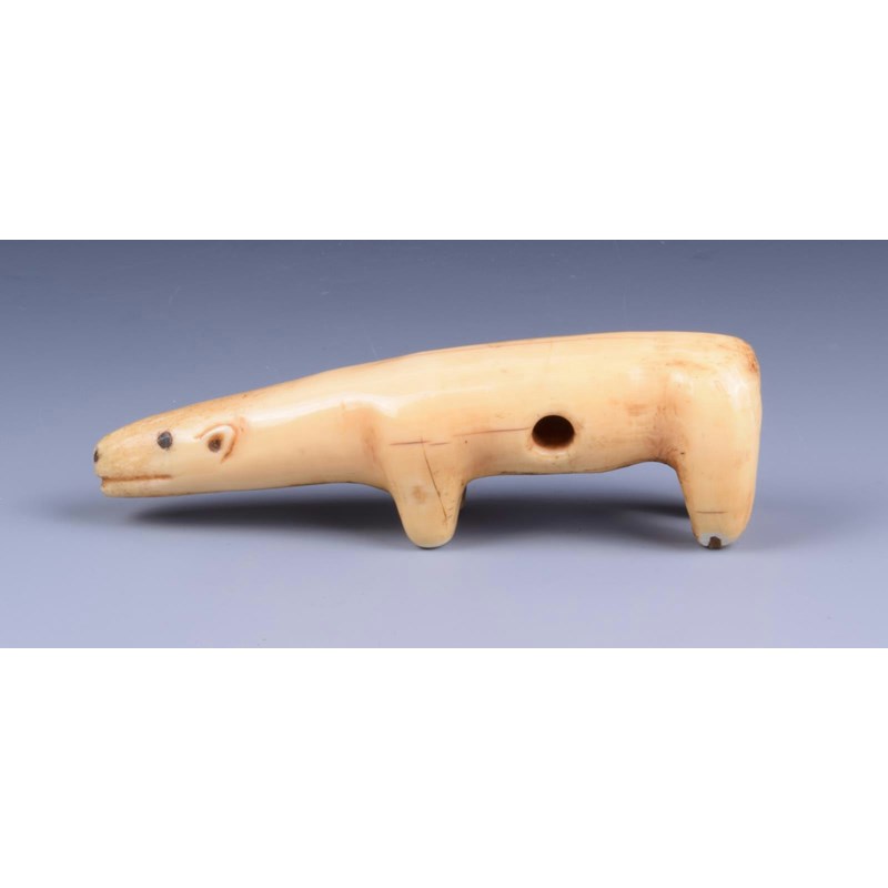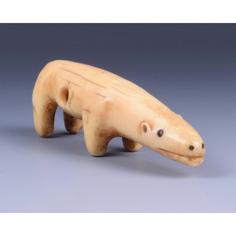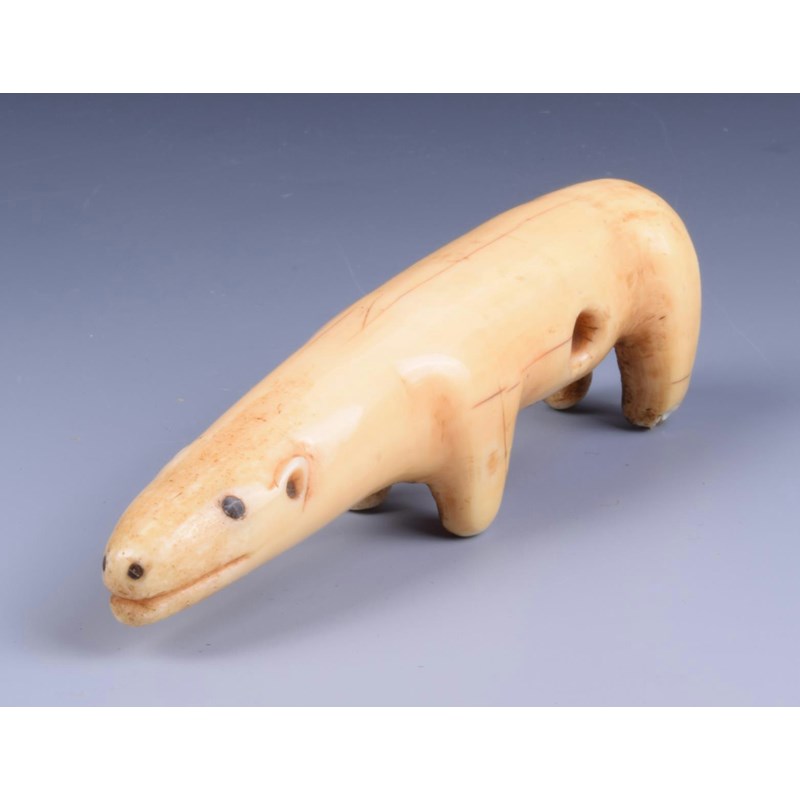 An Inuit whalebone amulet, carved as a bear with baleen inlaid eyes and nostrils, pierced through the body, 10.5cm long.