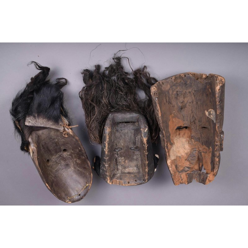 A Bete mask, with cloth, shells and fibre, 52cm high, a Dan mask with articulated lower jaw, aluminum eyes and a hair beard, 45cm high and an African west coast mask, 41cm high. (3)