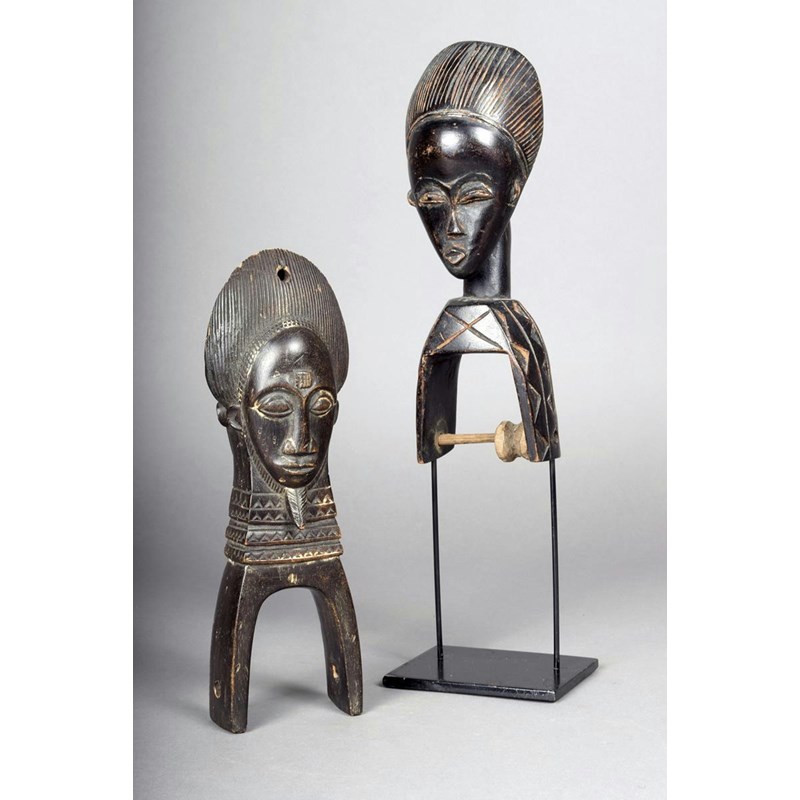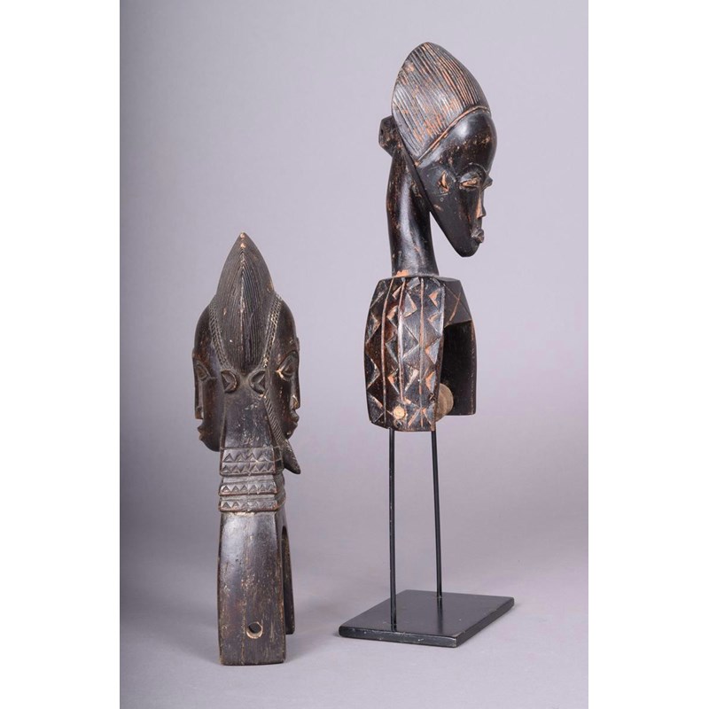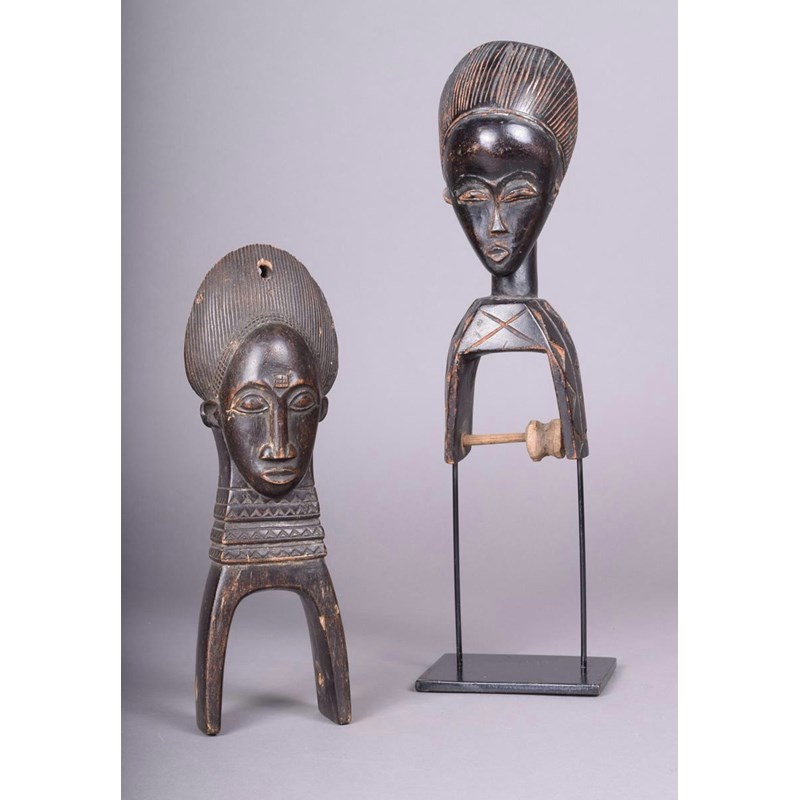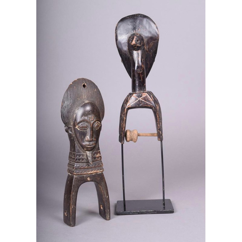 A Baule Janus heddle pulley, Ivory Coast, one mask with a short beard, 24cm high, and a Baule heddle pulley, with mask surmount, 23cm high, on a stand. (2)