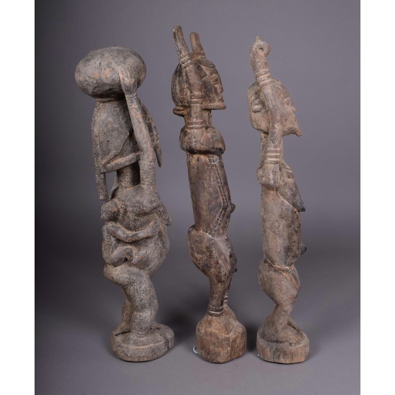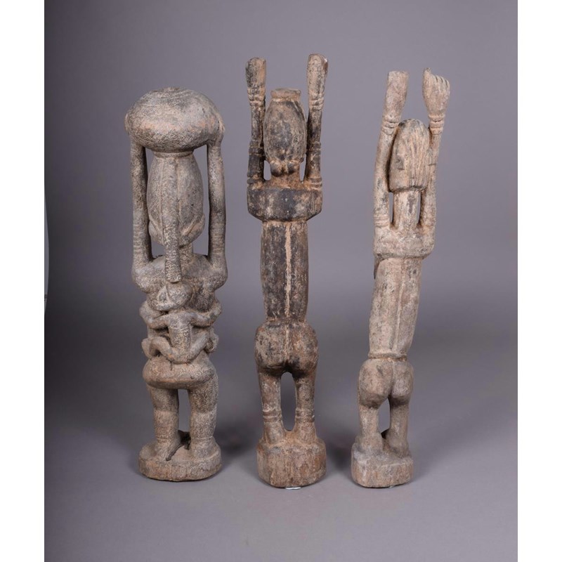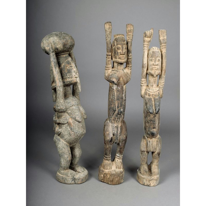 A pair of Dogon standing figures, male and female, with stretched arms, 67.5cm and 64cm high and a Dogon maternity figure with infant on back and pot on head, 62.5cm high. (3)