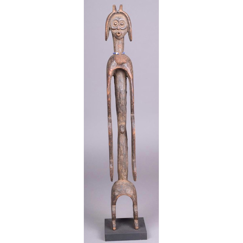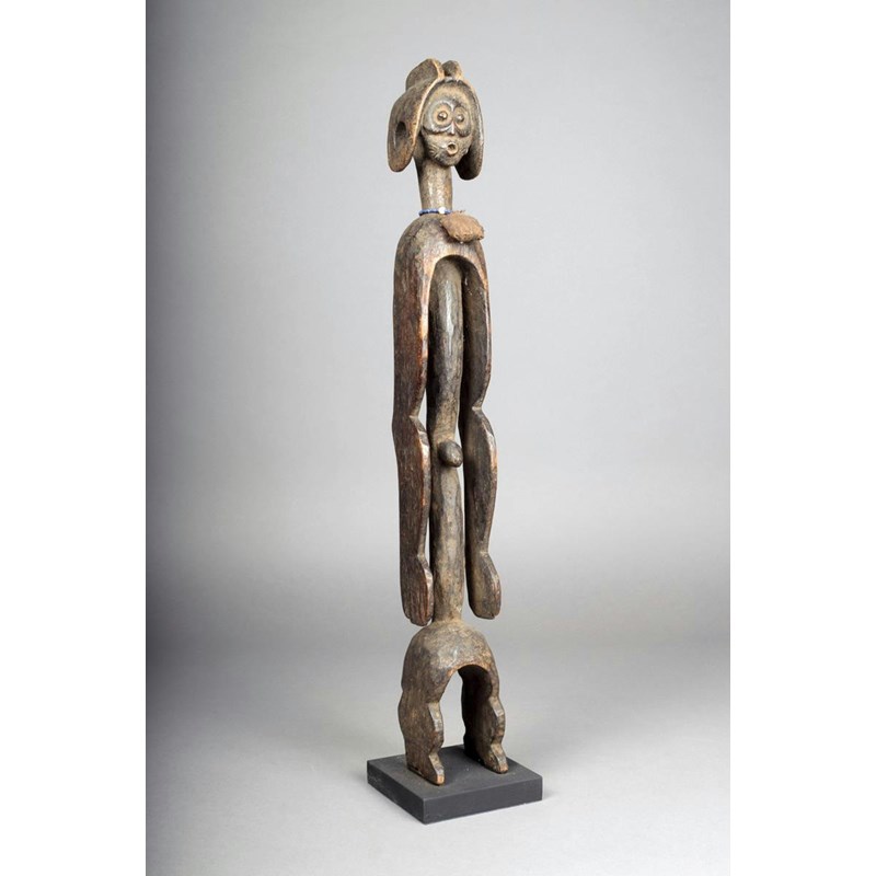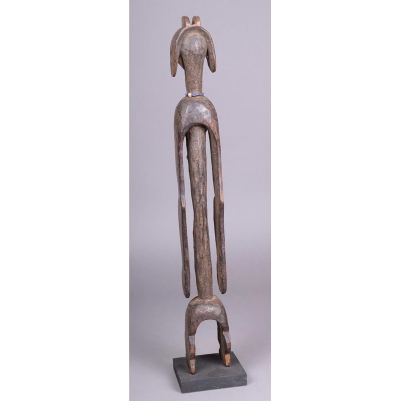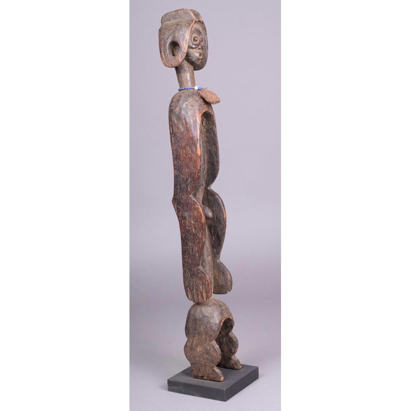 A Mumuye standing figure, Nigeria, with expressive face and pierced ear lobes, with bead and cloth necklace, long body and arms, 54.5cm high, on a stand.