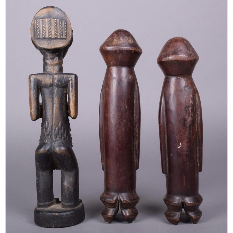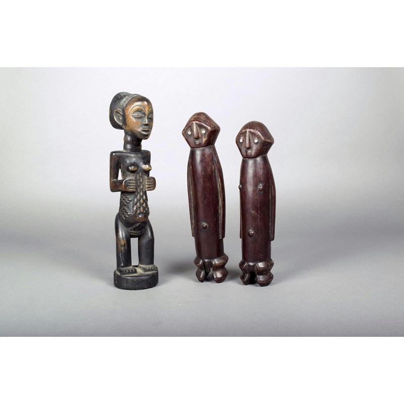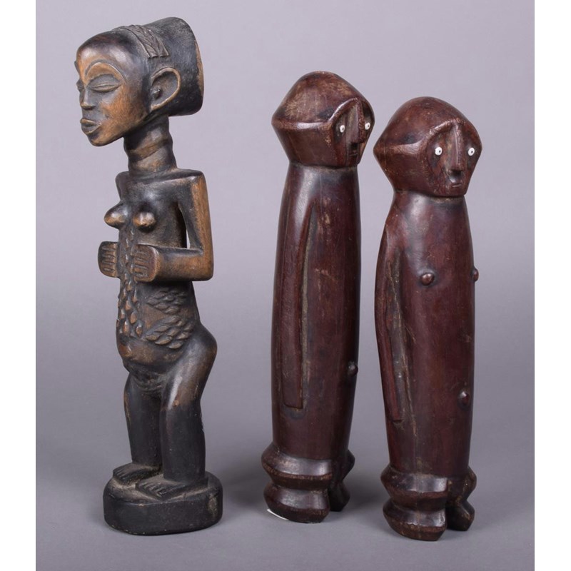 A Hemba standing female figure, D R Congo, with raised body scarifications, 33cm high and a pair of Wagera male and female figures with bead eyes, 28cm and 30cm high. (3)
