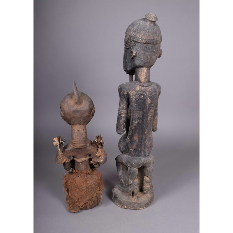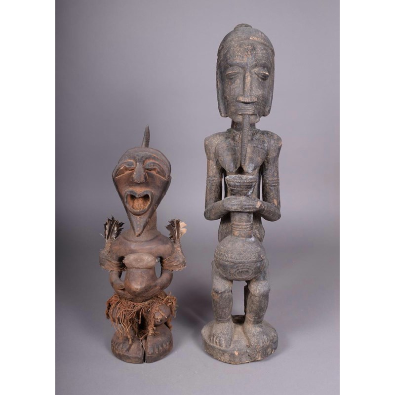 A Congo fetish figure, with horn surmount, inset metal rivets, feathers and cloth, 53.5cm high and a Dogon seated figure with a vase, 76.5cm high. (2)