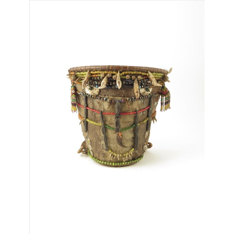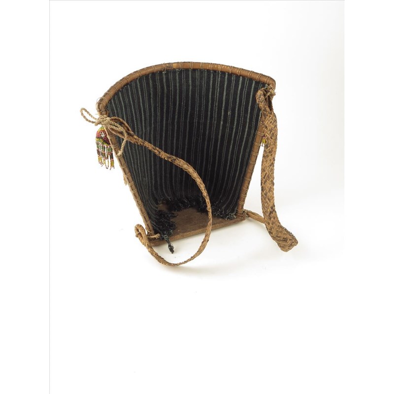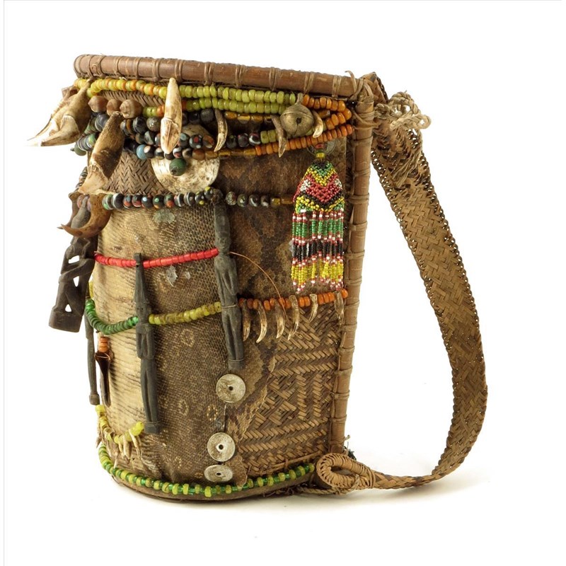 A Dayak baby carrier, woven grass with reptile skin, beads, teeth, claws, shell, coins and carved wooden figures, 34.5cm high.