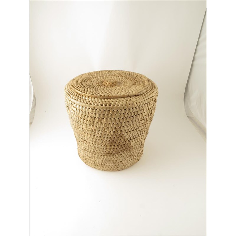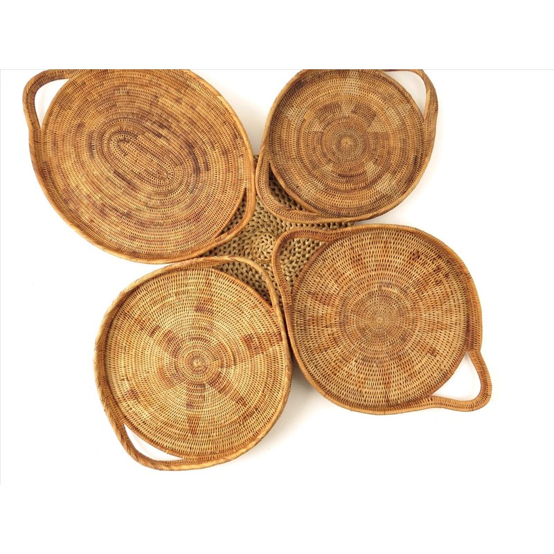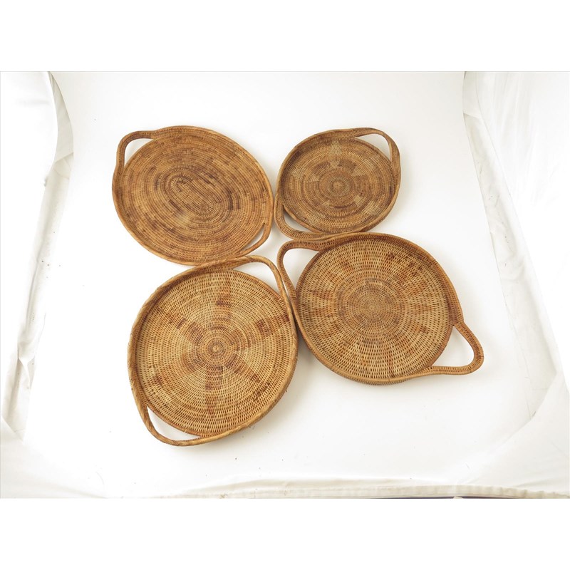 Four Solomon Islands two handled rattan trays, 53cm largest across handles and a basket and cover. (6)