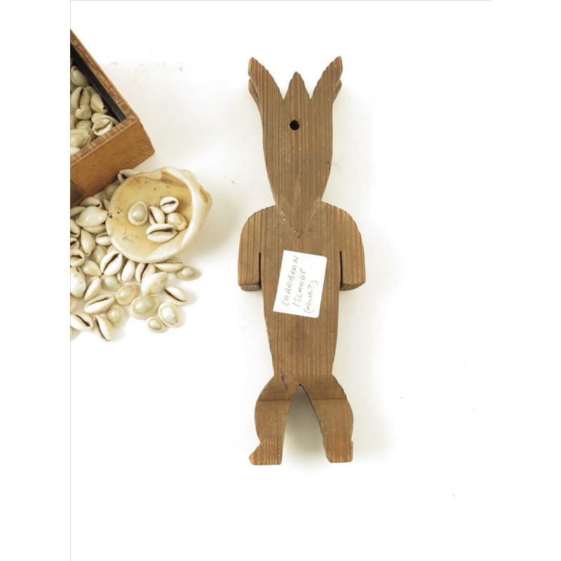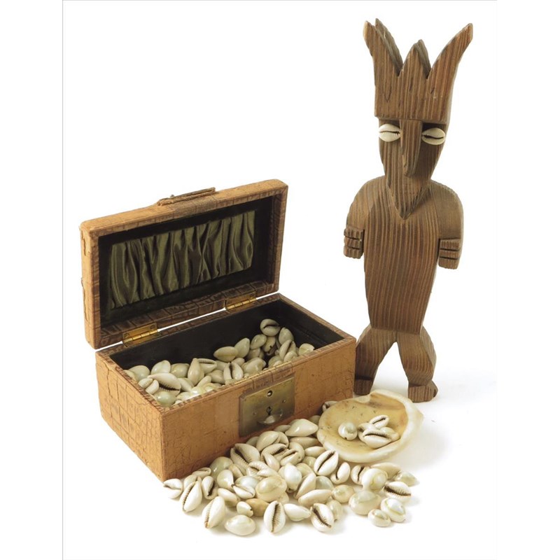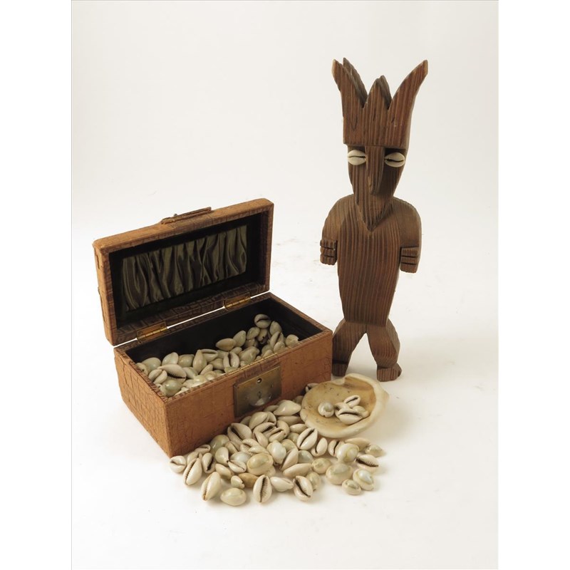 A quantity of cowrie shells, in leather covered box and a polynesian style figure, 30cm high.