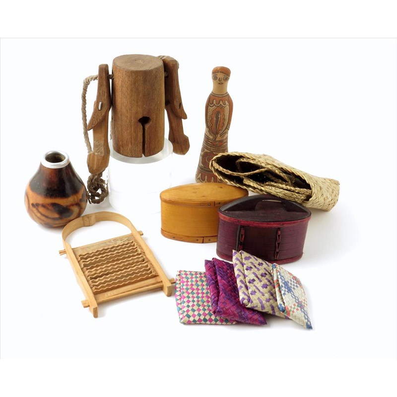 Two wood and bamboo eliptical containers, 12cm wide, a Maori flax purse with strap handle, four coloured purses, a bamboo grater, a gourd with metal rim, a pottery figure and a carved wood bell. (11)