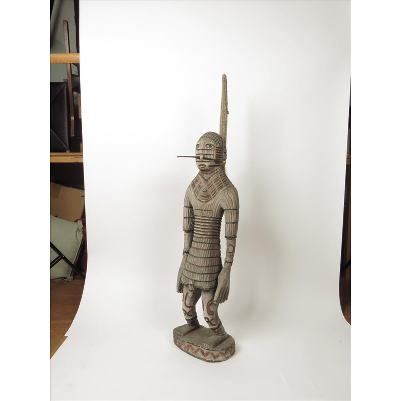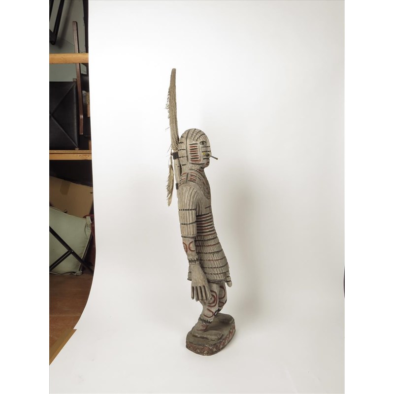 An Asmat male warrior, Papua New Guinea, with ribbed body and wearing a nose bar, with a covered spike to his back with feather, beads and seeds, 117cm high.
