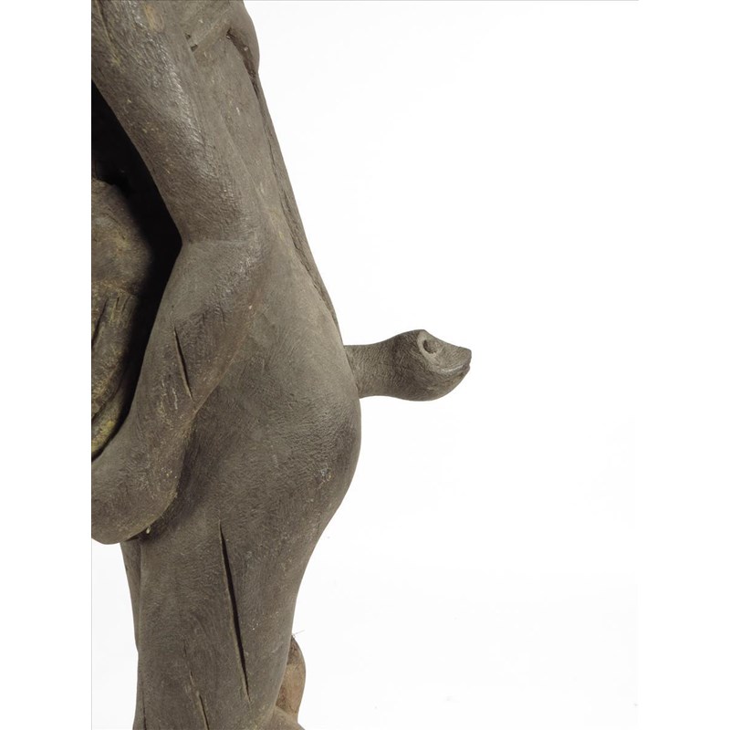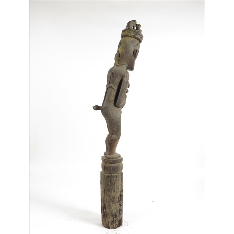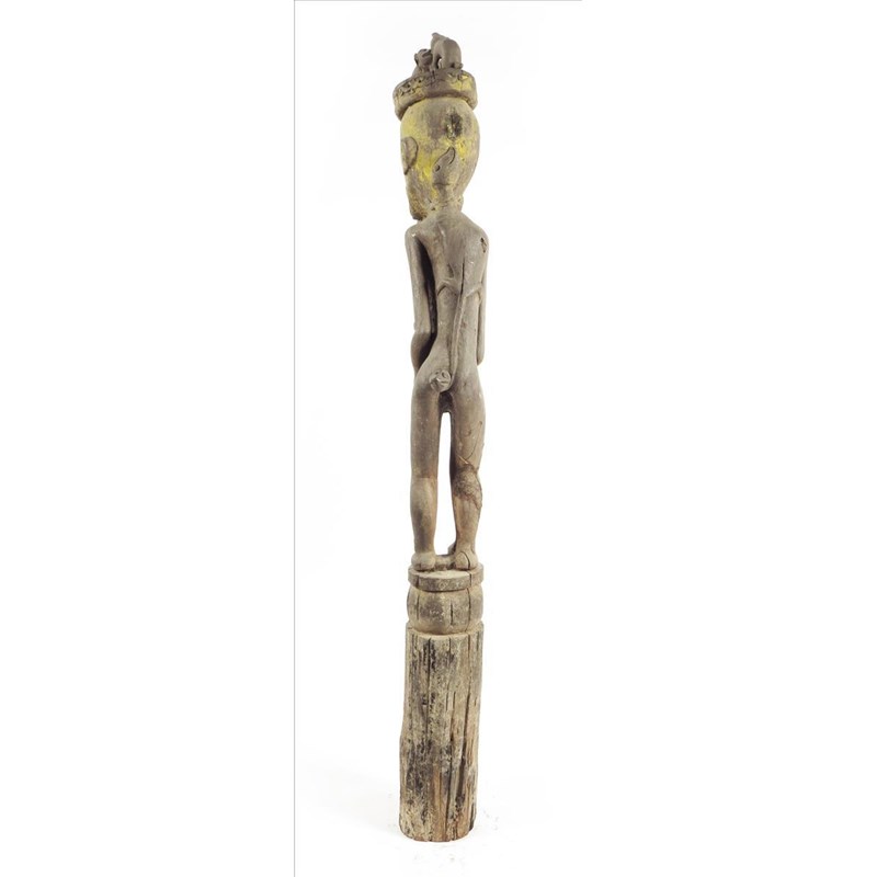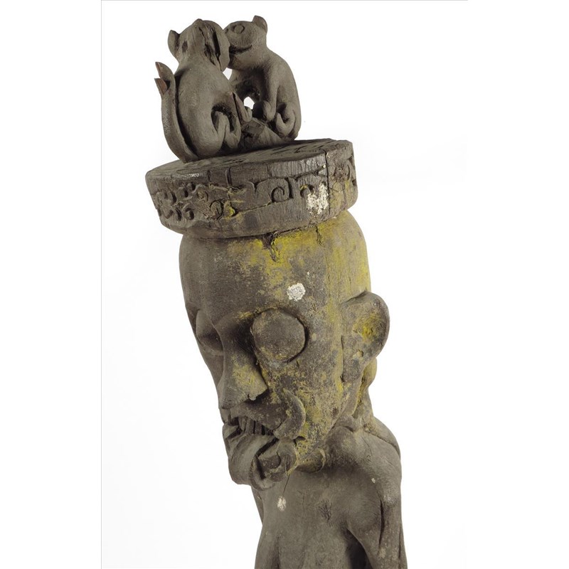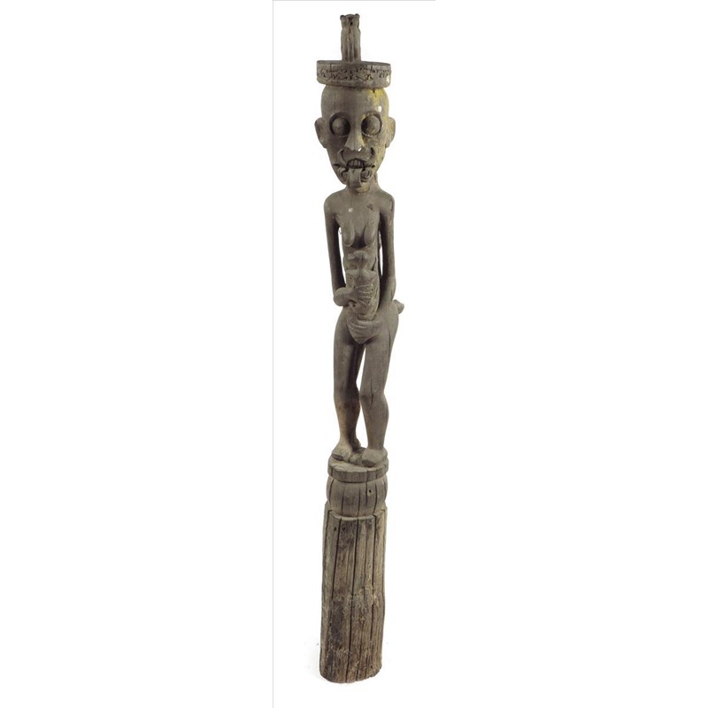A Nias carved fertility figure house post, Indonesia, standing holding an infant with lizard on her back and a twin monkey cresting, 182cm high.
