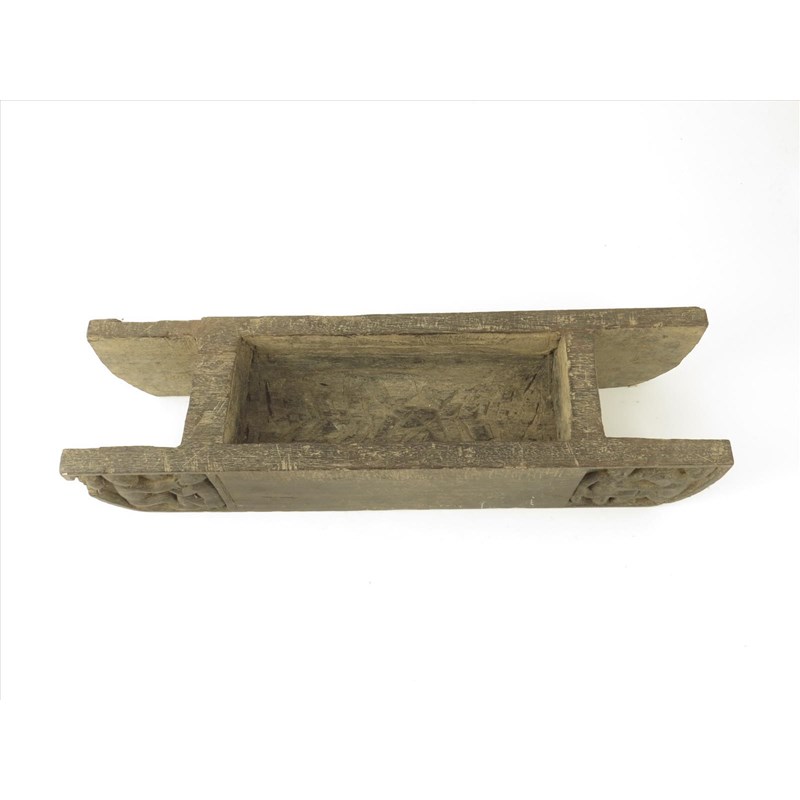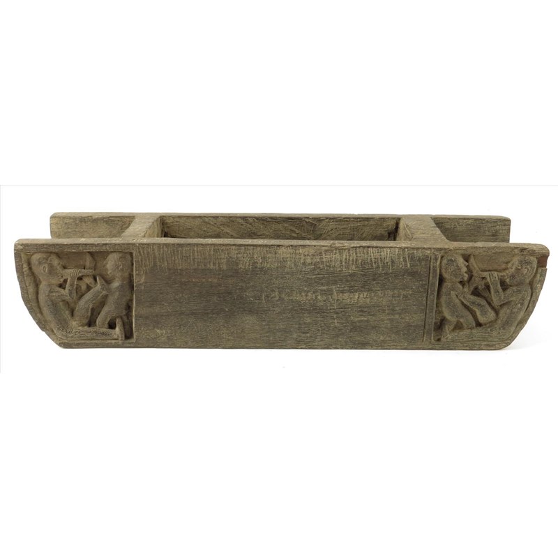 A Sumba food trough, Indonesia, the curved ends relief carved decorated figures fighting and a woman giving birth, 63.5cm long.