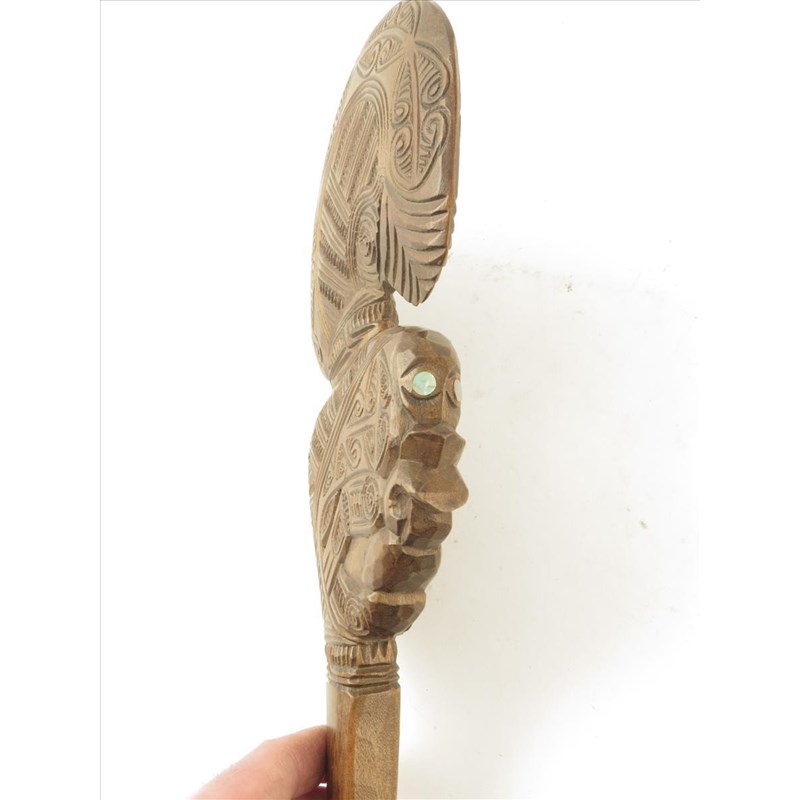 A Maori carved hand club, with shell inlay, 33.7cm high.