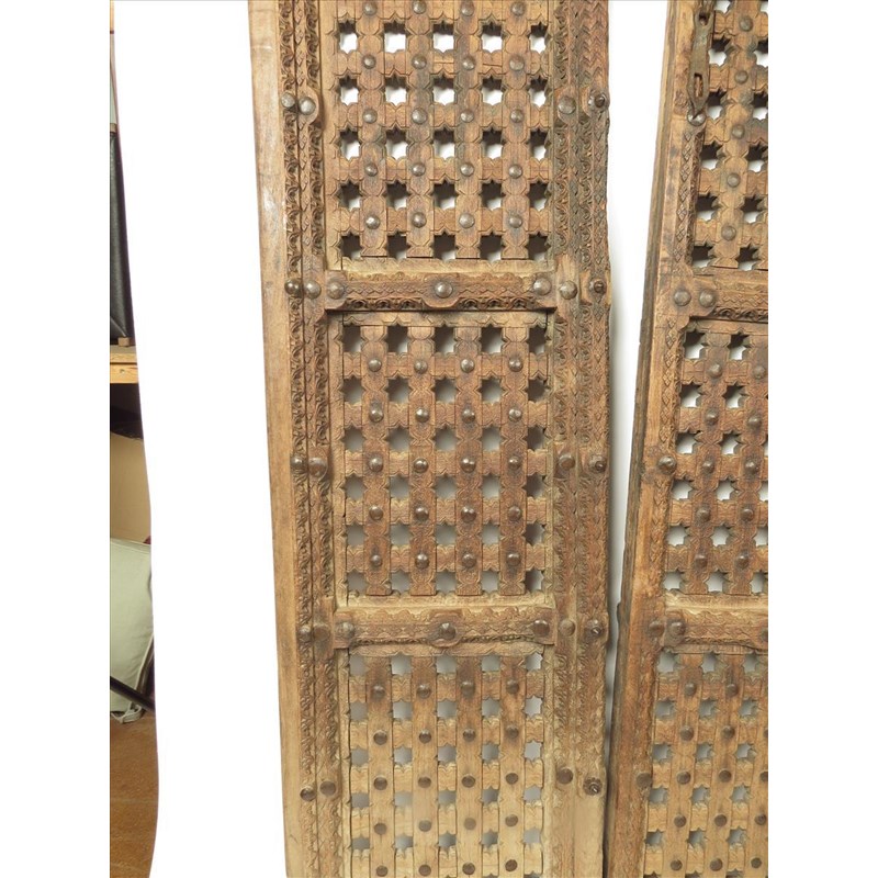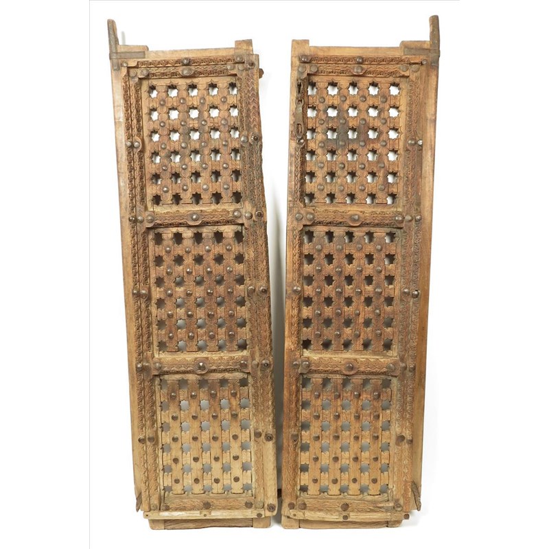 A pair of Jarli hardwood doors, India, with carved decoration and metal bosses, 156cm high, 44.5cm wide. (2)