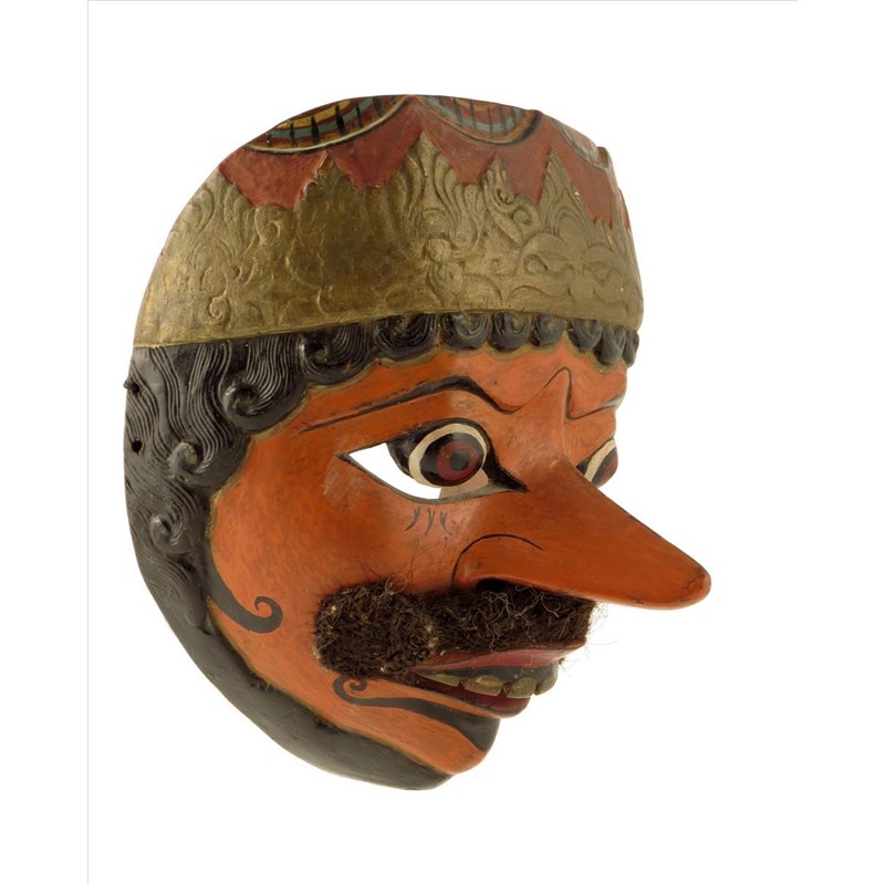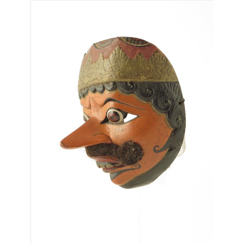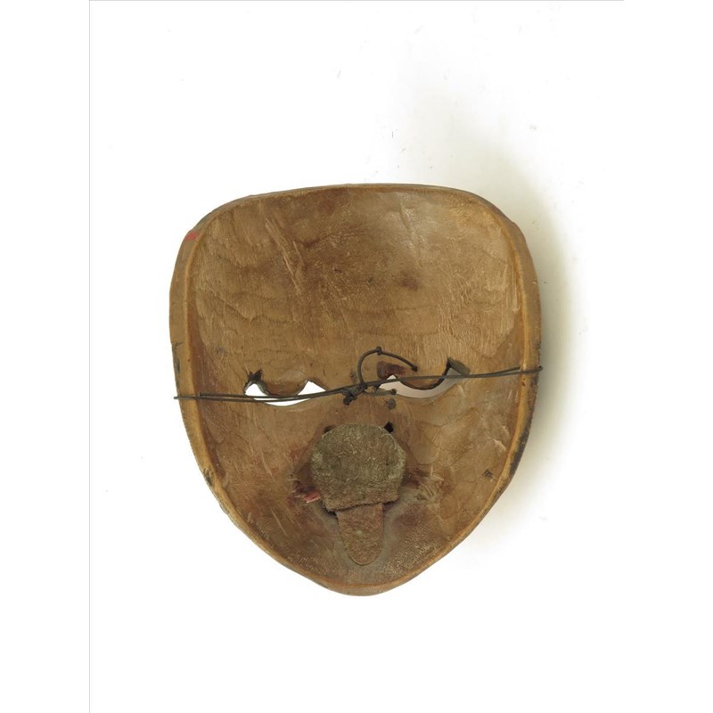 A Java mask, with well carved coiffure and applied hair moustache, pierced eyes and mouth, with leather pad to the inside, 18.4cm high.