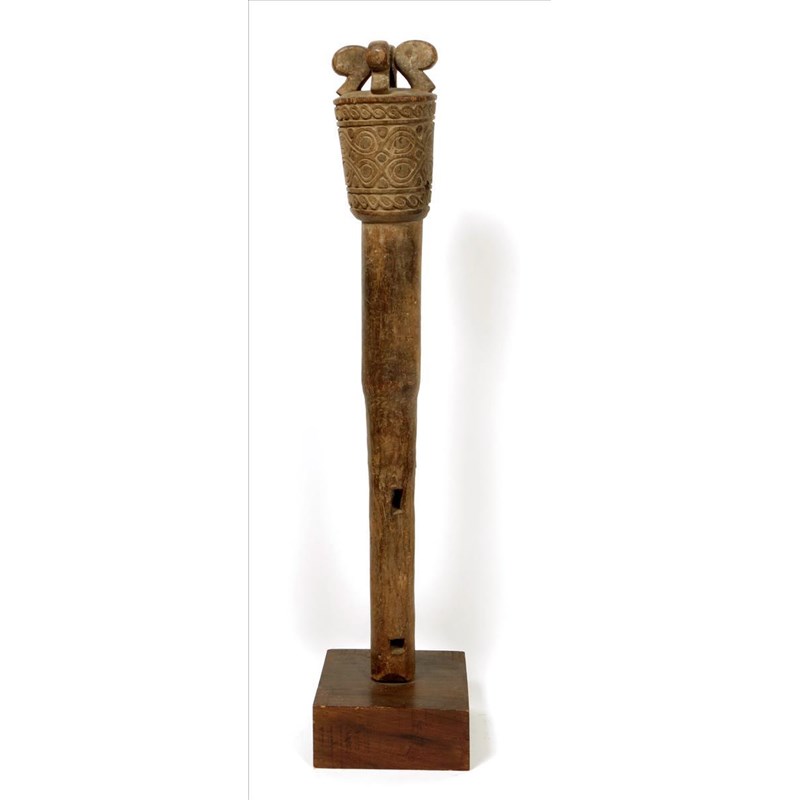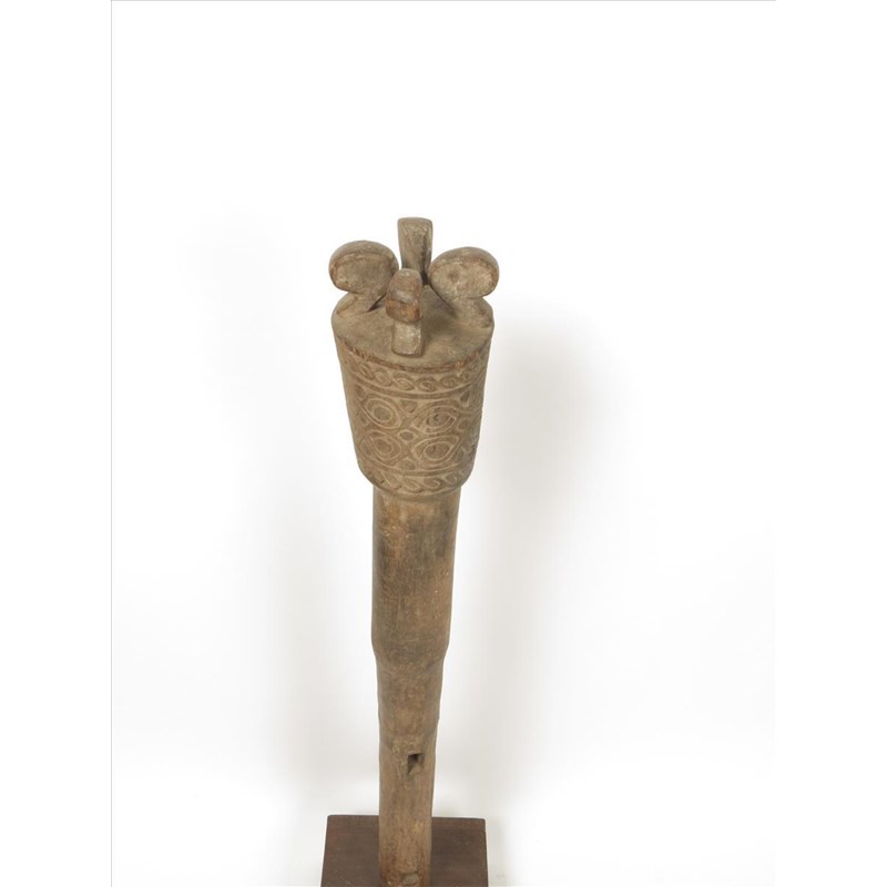 An Indonesian post, the tapering raised top with scroll decoration and four scroll surmounts, the shaft with join apertures, 82.5cm high, on a later stand.