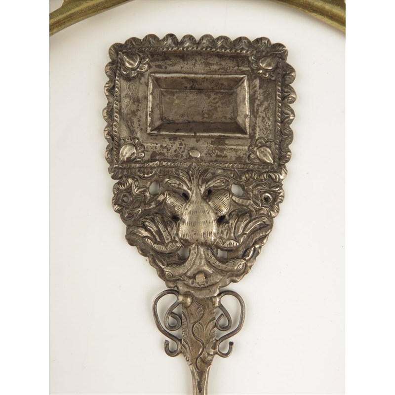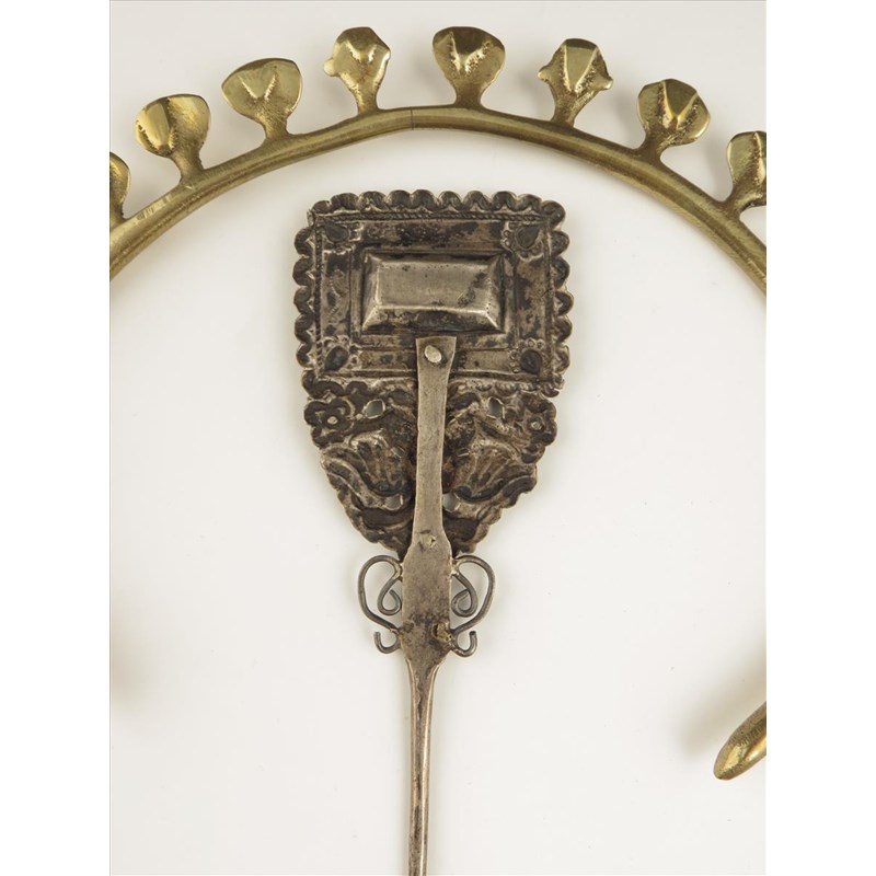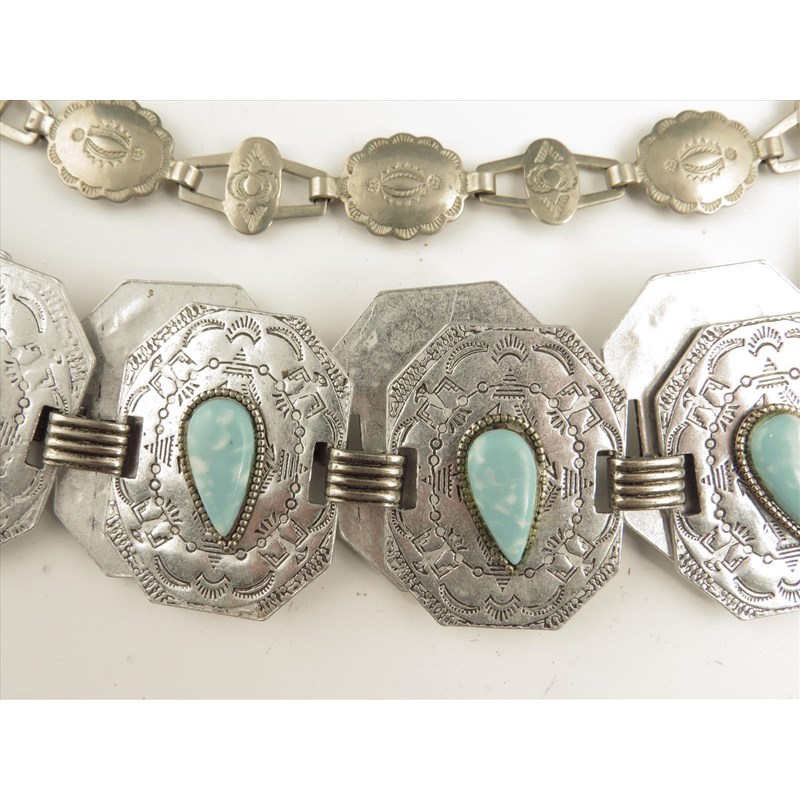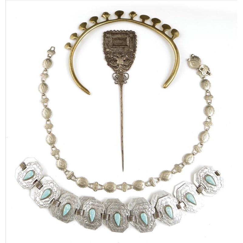 A Naga gilt headdress, 20cm wide, a silver coloured metal hair pin, embossed a double headed eagle, 24.3cm long, a Mexican belt with tear drop cabouchons and another belt. (4)