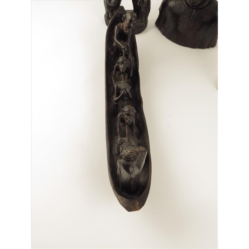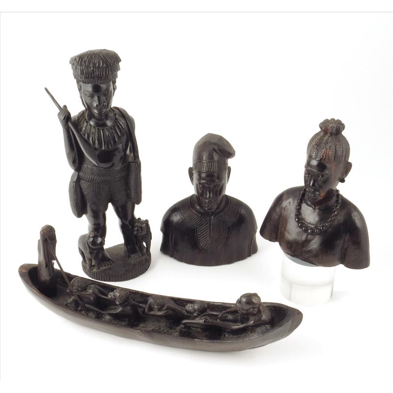 An ebony carved warrior, with two dogs and a spear, 44cm high, a canoe group and two busts. (4)