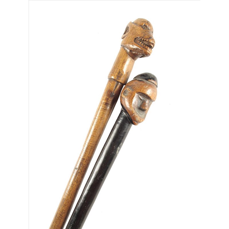 An African staff, carved a monkey head with serrated teeth, 35in (89cm) long, and another carved a head with a domed cap, 36in (91.5cm) long. (2)