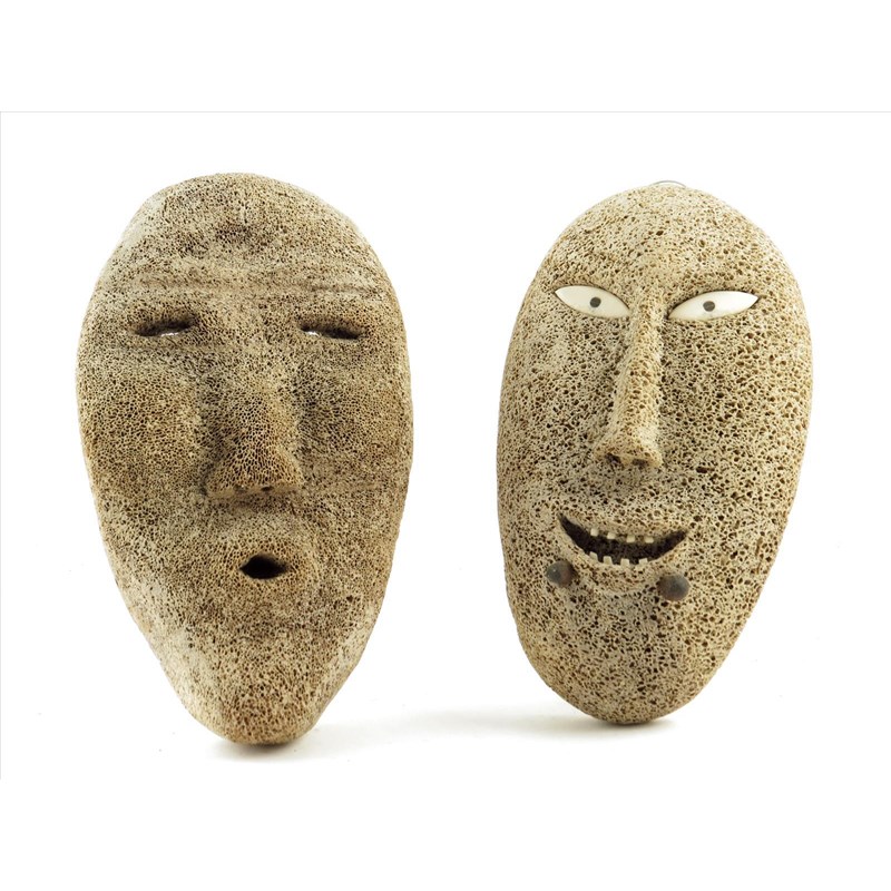 An Inuit whalebone mask, with bone inlaid eyes and teeth, 23cm high, an Inuit whalebone mask with pierced eyes, 22.5cm high. (2)