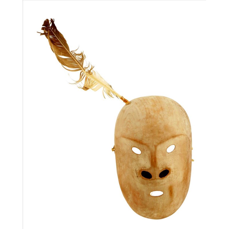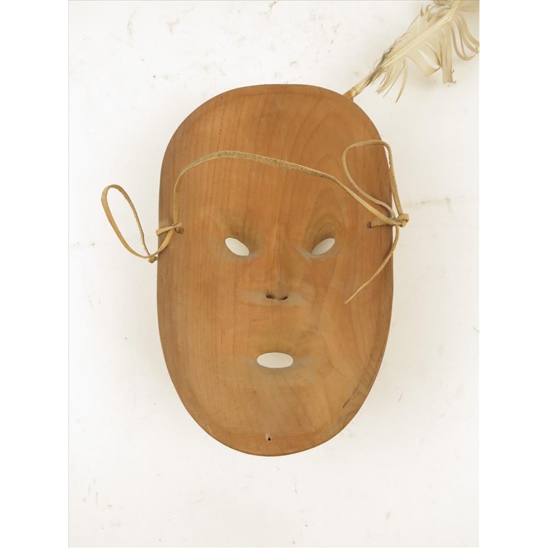 An Inuit wood mask, with an inset feather, 39.5cm high.