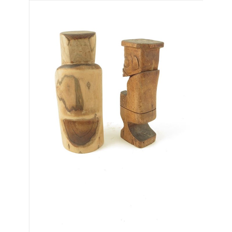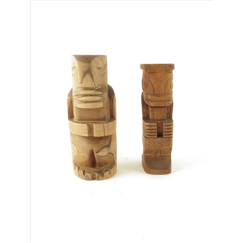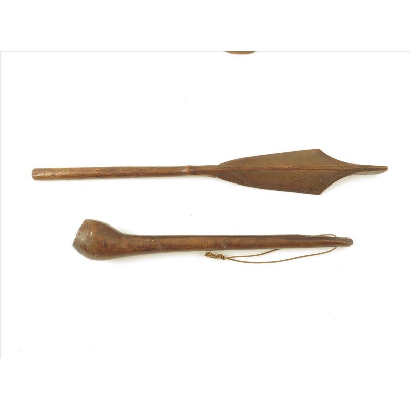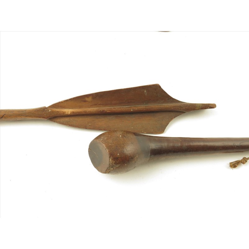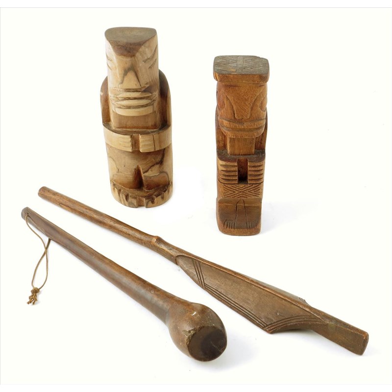 An unusual polynesian staff, of arrow head design, 54.5cm long, a hardwood club and two Haida style figures. (4)