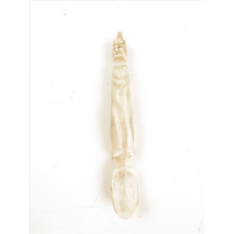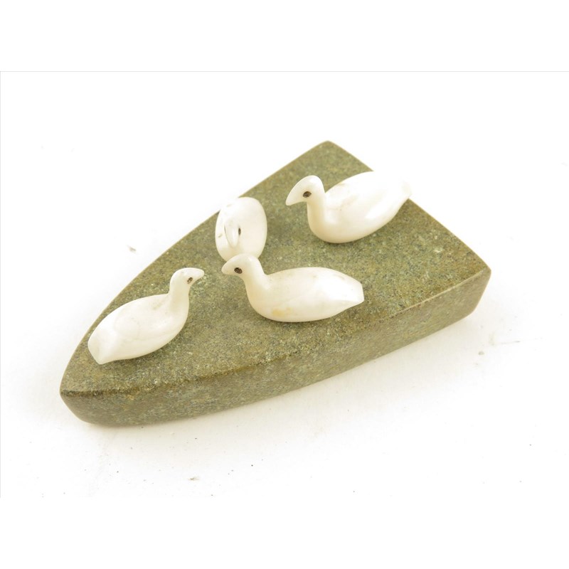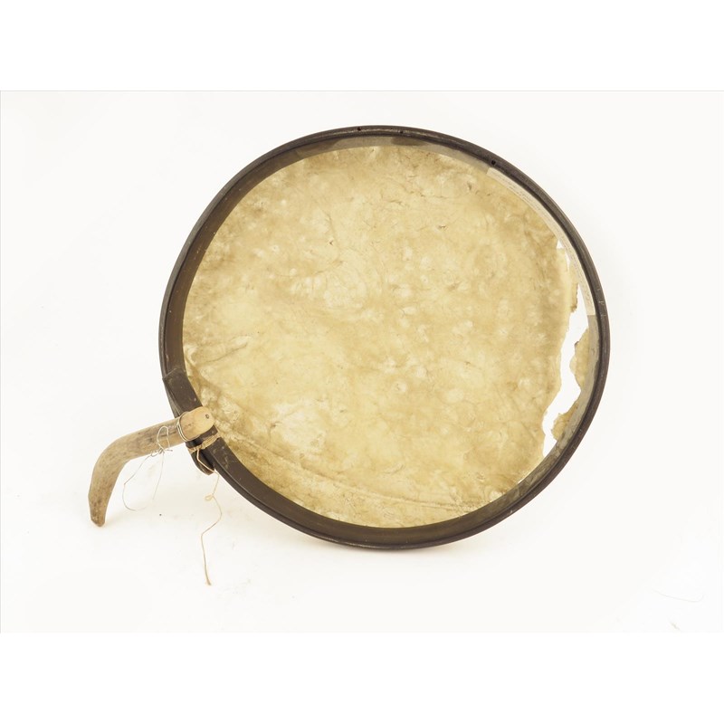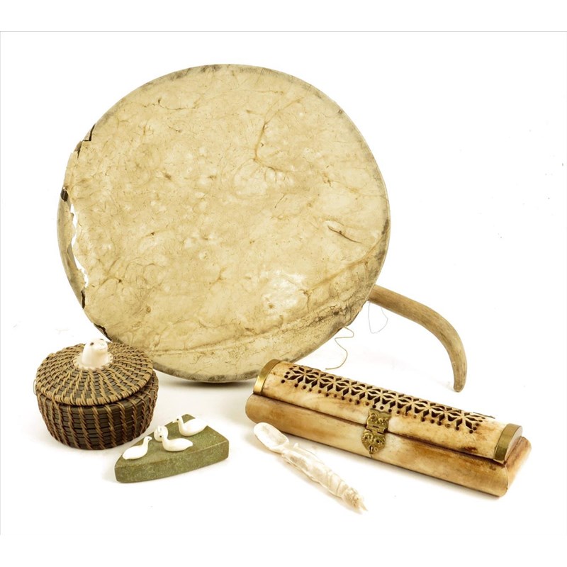 An Inuit baleen and bone circular box and cover, with a seal head terminal, 7cm high, an Inuit drum, bone, baleen and hide, 25.5cm diameter, an Inuit four bird bone and greenstone group, an Inuit bone spoon, a brass mounted bone box, 19.5cm long. (5)