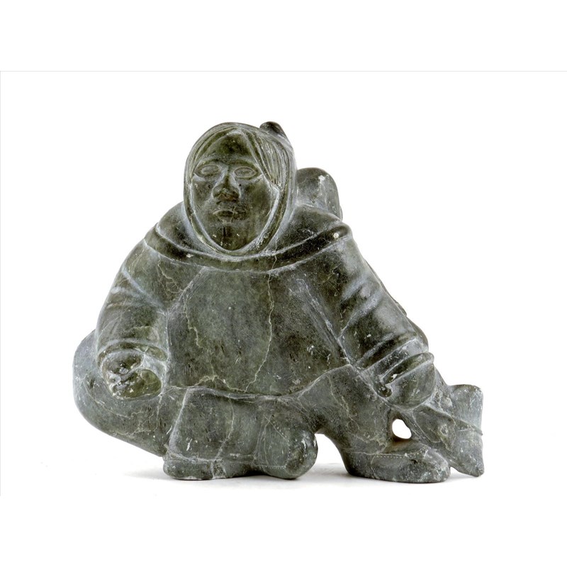 An Inuit carved greenstone group by Elisseapik, figure with seal tied to his back, signed, 18cm high.