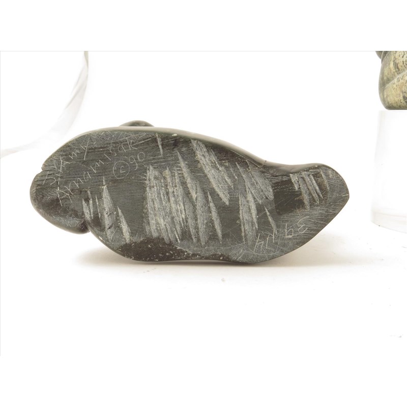 Three Inuit greenstone carved fishermen, all signed and two dated 1979 and '90, 27cm, 20cm and 18cm high. (3)