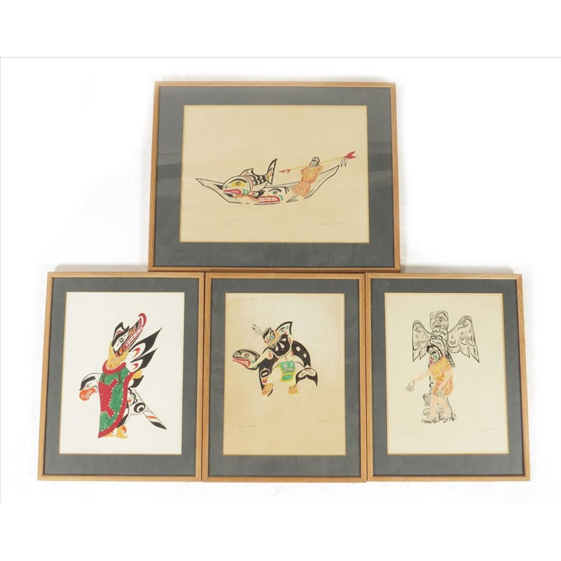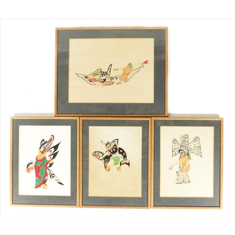 Allen James. Seagull Dance; Wolf Dance; Dance; Spawning Salmon Dance, watercolour and gouache, tilted and signed, 33 x 43cm largest. (4)