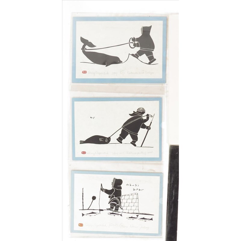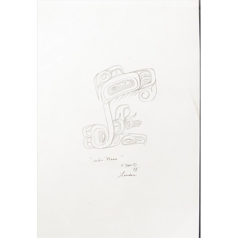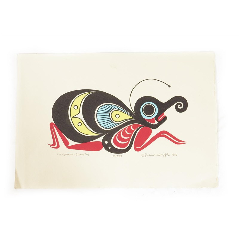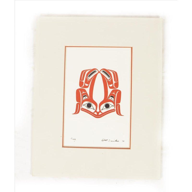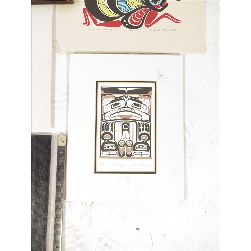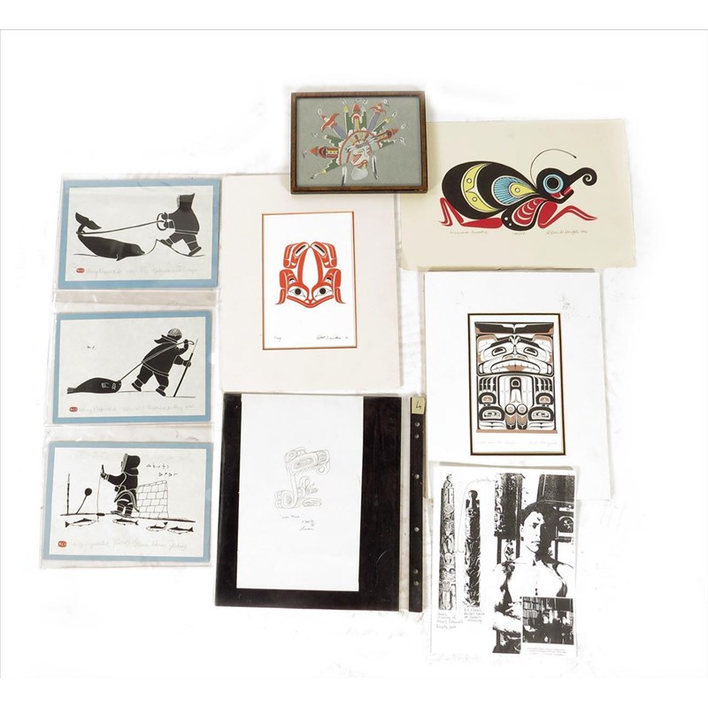 Two prints after Robert Davidson, Raven with broken beak and Frog, 22 x 14.5cm, mounted, three Inuit prints by Henry Napartuk, a pencil drawing by V. David, Stlakumma - Butterfly, a print by Robin K Wright, Black Bear Box Design, print by Carl Stromquist, and a gouache native headdress. (9)