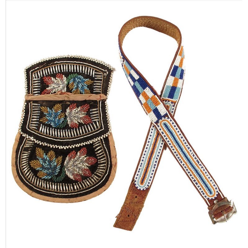 A North American beadwork purse, floral decorated both sides, 7½in (19cm) high and a leather and beadwork belt. (2)