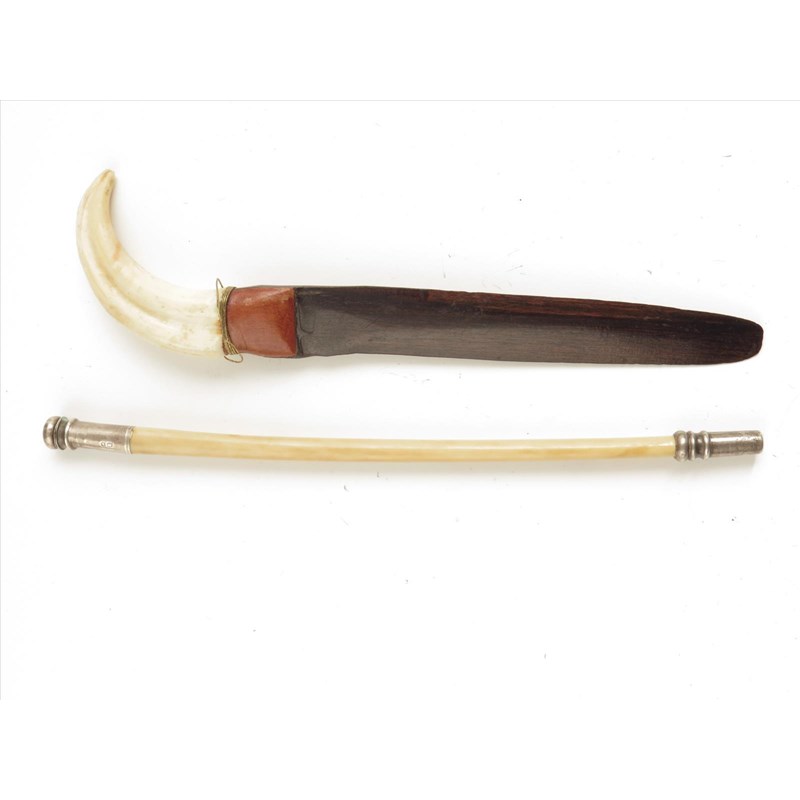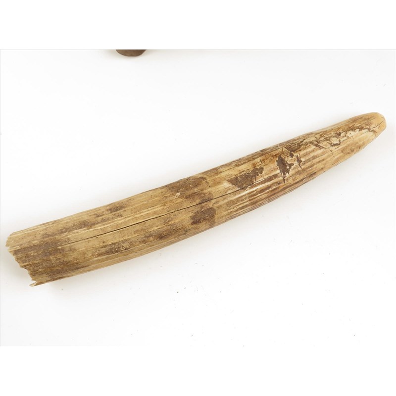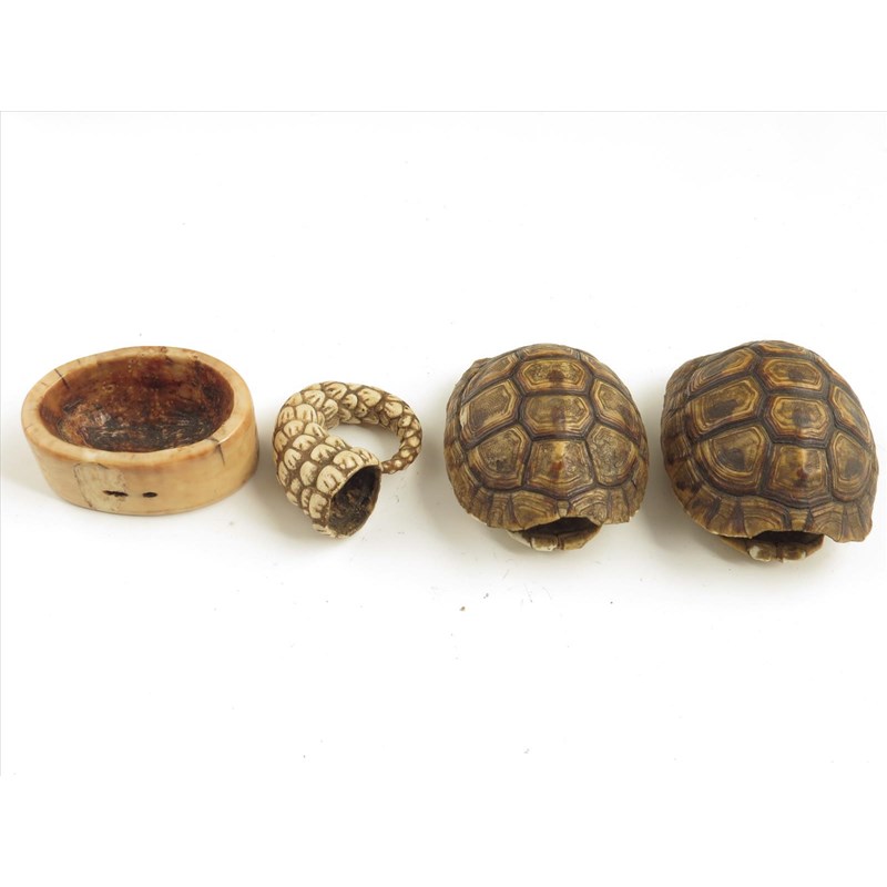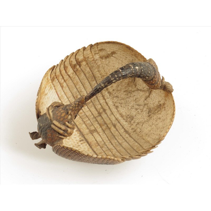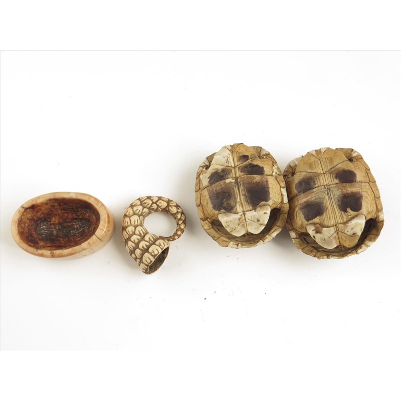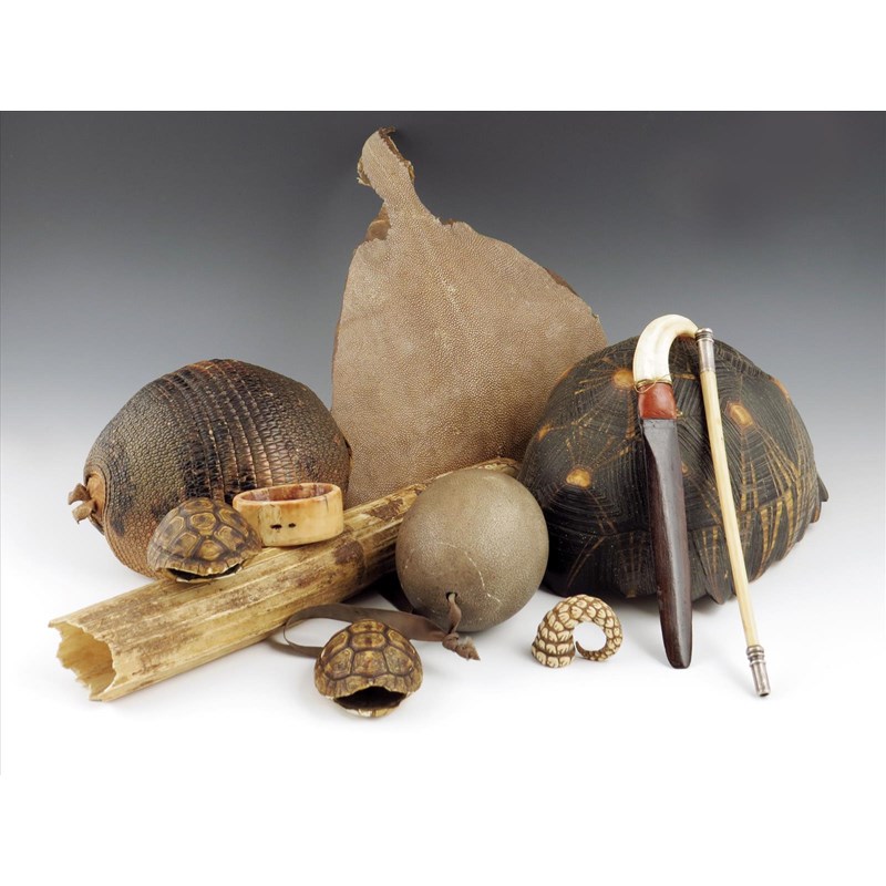 A collection of Natural History pieces; a tortoiseshell, 26cm long, two terrapin shells, 7cm long, an armadillo basket, an emu egg, a faceted tusk, a marine ivory ointment pot, 2.5cm high, a pangolin tail, a tusk handled letter opener, 23cm long, an Edwardian silver mounted bone pipe and a ray skin. (11)