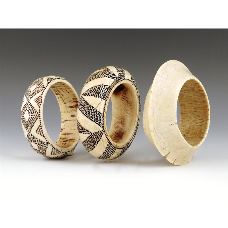 A Sudan ivory bracelet, of flared form to a medial ridge, 13.2cm wide, and two dot decorated ivory bracelets, 10.8cm and 12cm wide. (3)