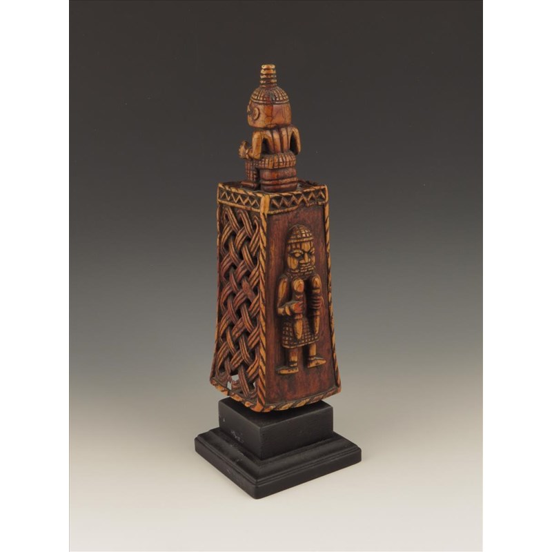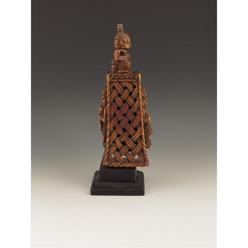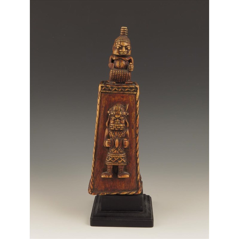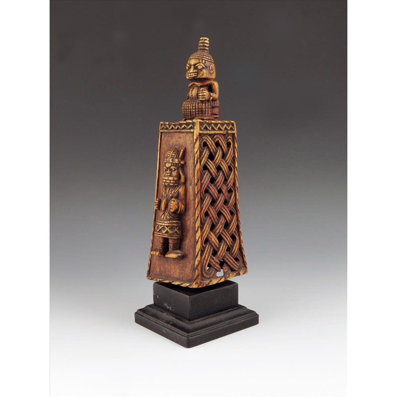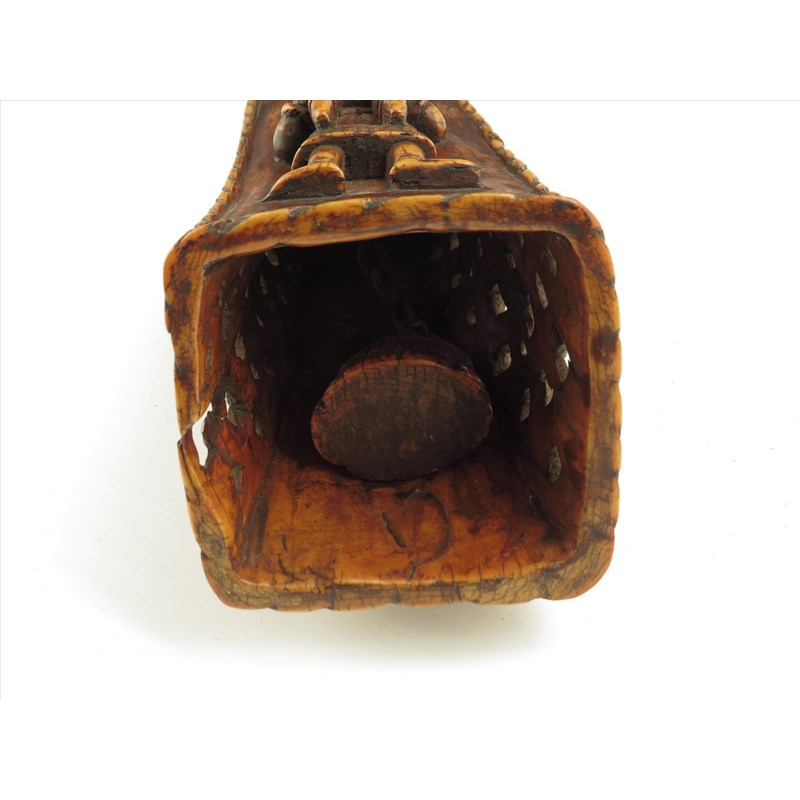 A Benin ivory bell, Nigeria, with a seated figure surmount on a square tapering body with pierced and carved interlaced sides, the front and back with relief carved standing figures, with a mask clapper, 25.5cm high on a later stand. (2)