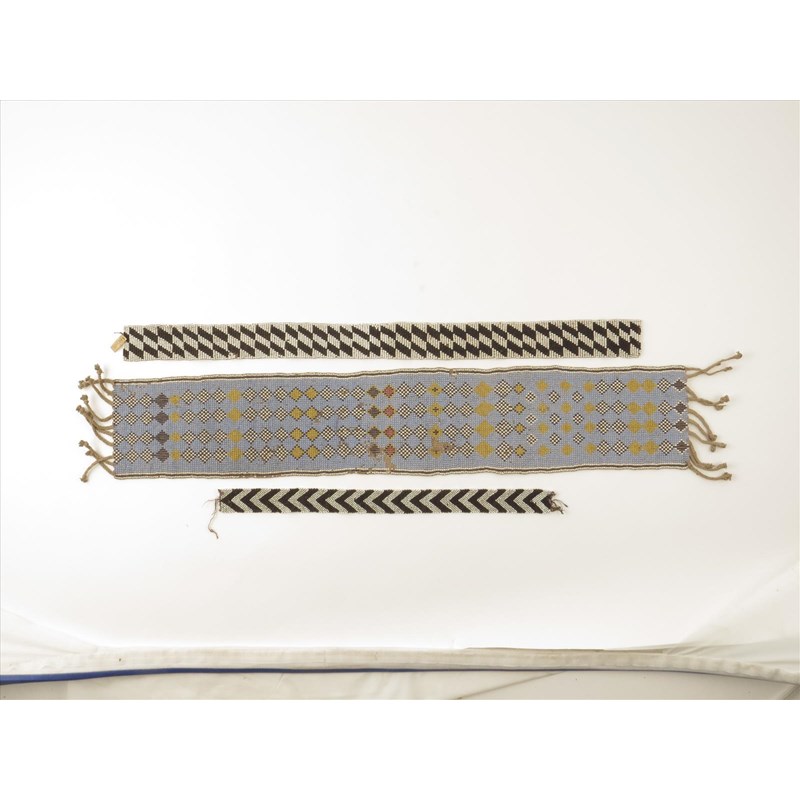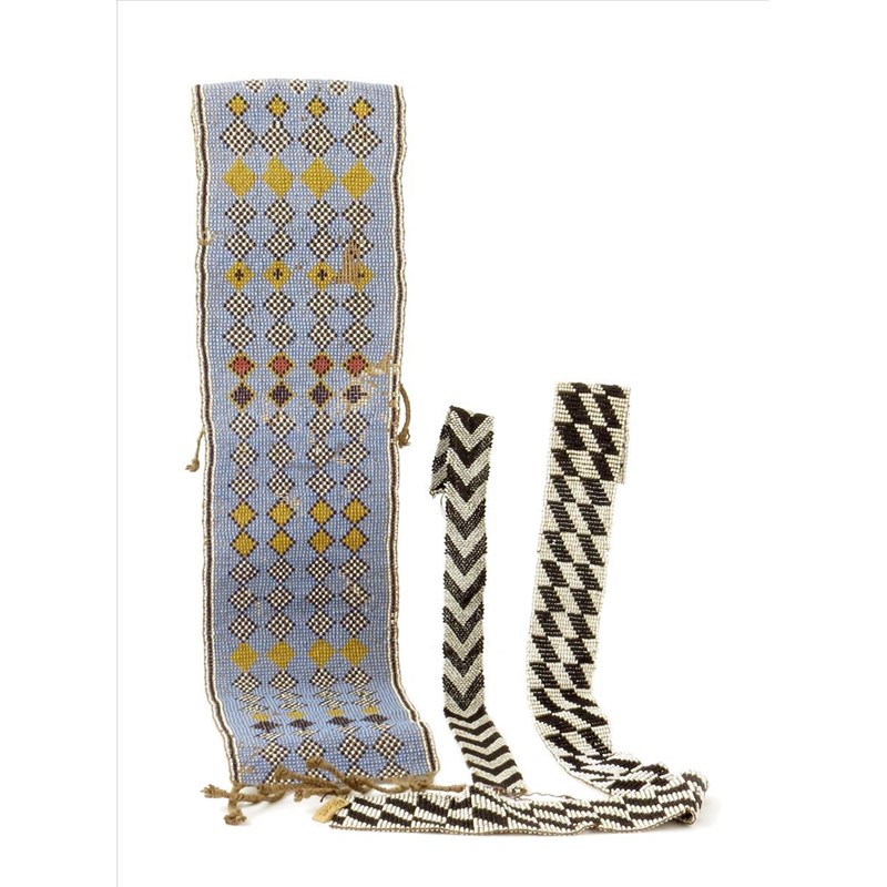 Three African beadwork bands, the largest 82cm long, the middle one with an inventory label '13091.' (3)