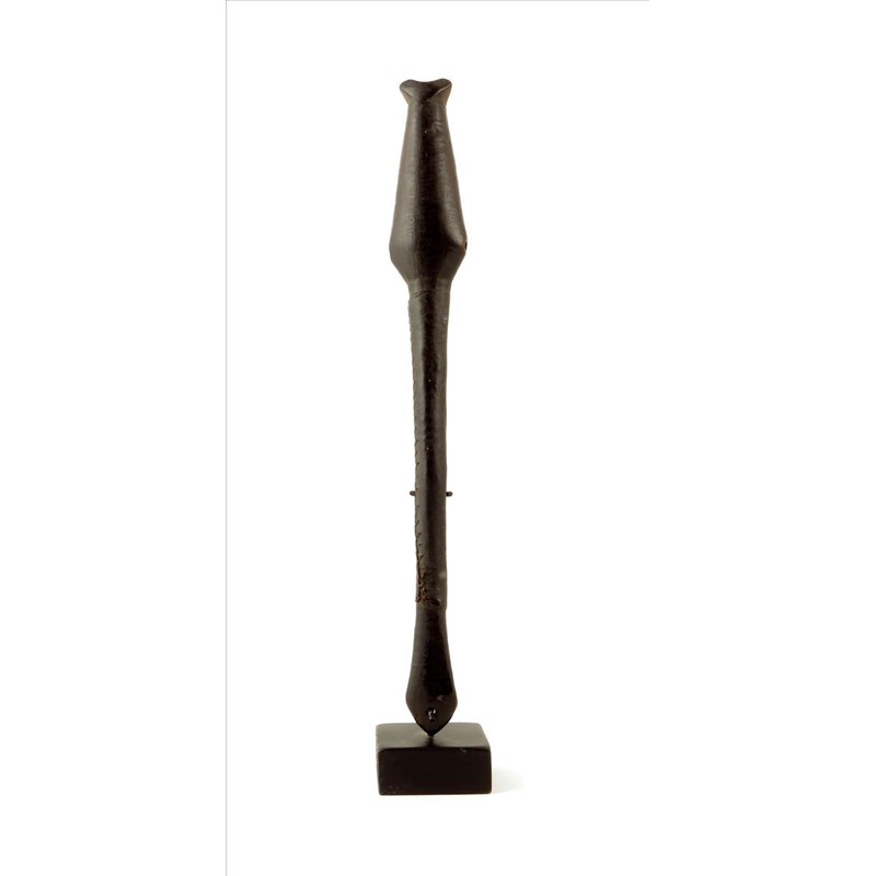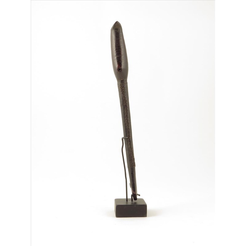 A Mossi wood flute, Burkina Faso, with a pierced vase shape head, leather covered handle and tapering base, 40cm high, on a later stand. (2)
