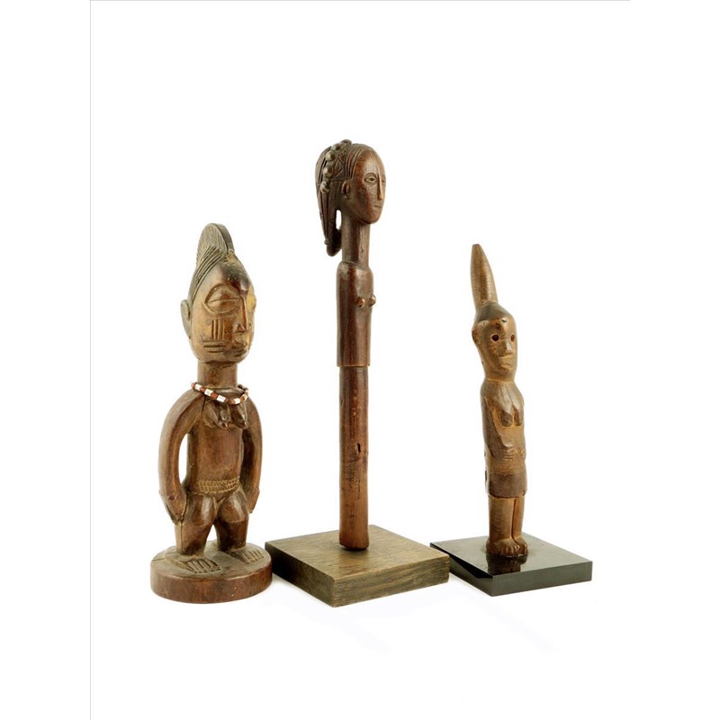 A Yoruba standing female Ibeji, Nigeria, with traces of blue pigment to the coiffure, with bead necklace, 26cm high, a Congo staff with a female bust terminal, with tied back coiffure and brass studs, 30.5cm high and a Congo standing female figure. (3)