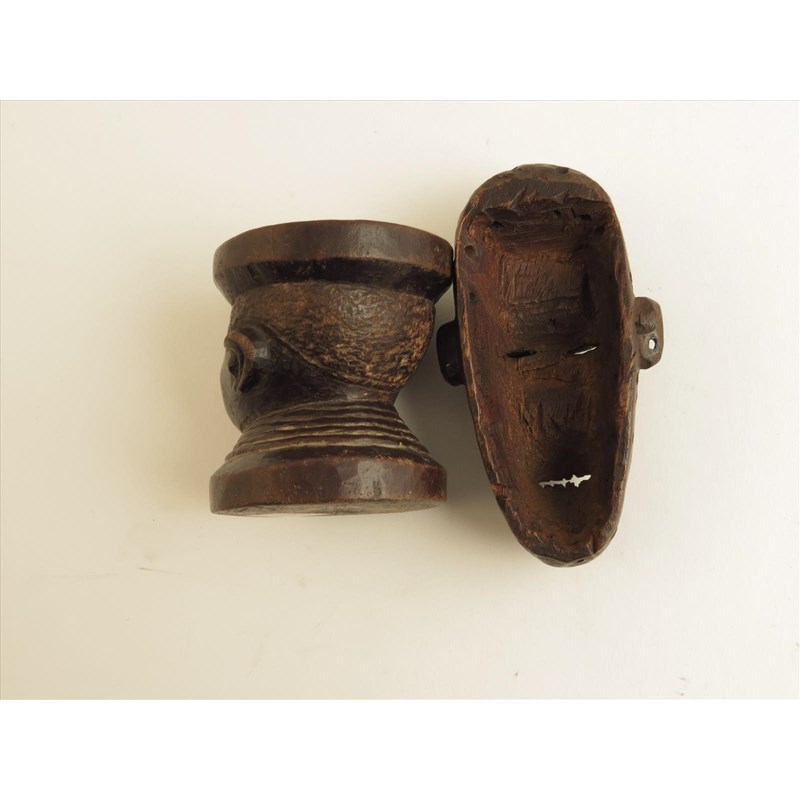 A Chokwe wood passport mask, Angola, with black staining to coiffure, eyes and lips, cross scarification to the forehead, 13cm high and a carved wood ointment mortar, Congo, with a head on a stepped base, 8.5cm high. (2)