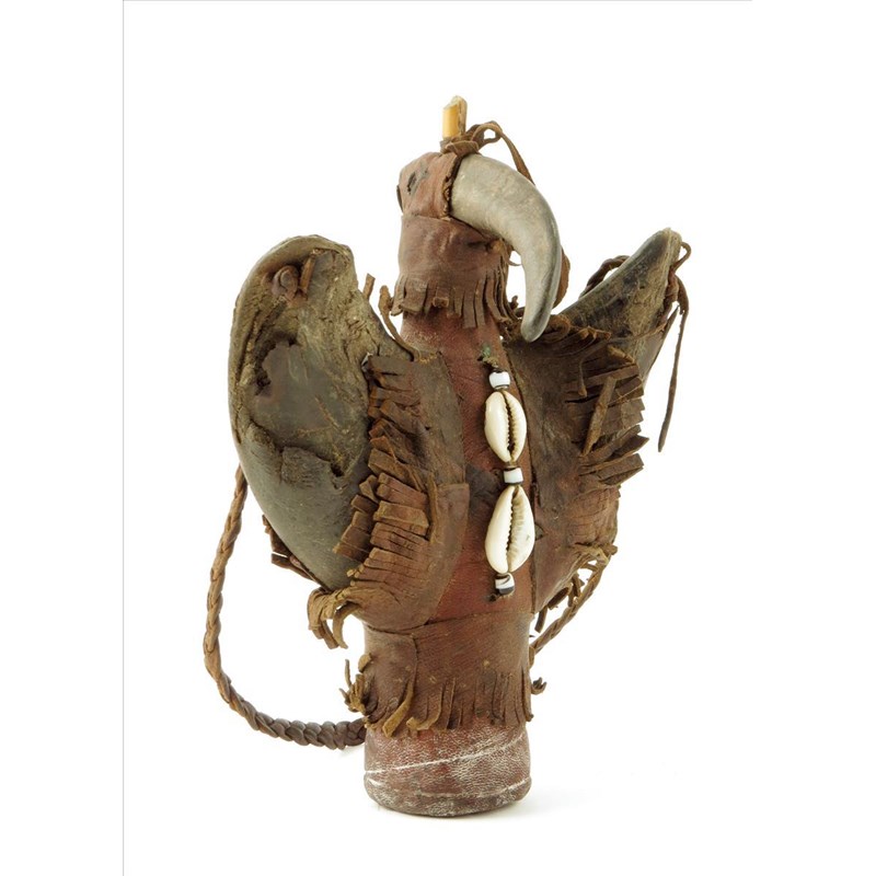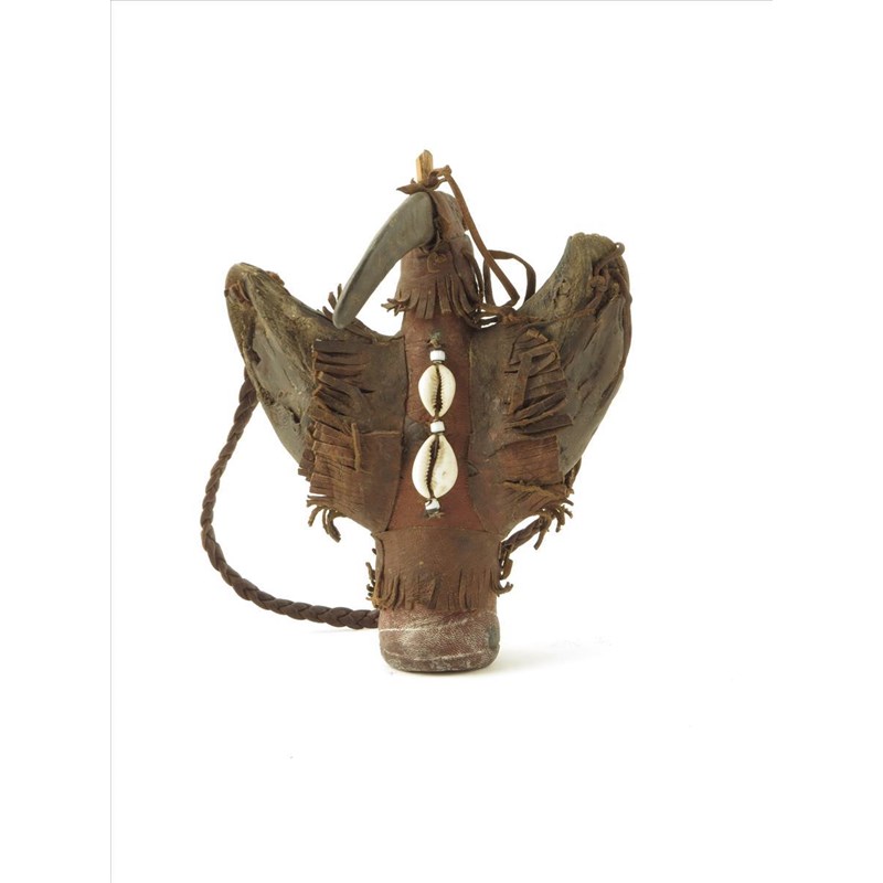 A leather thunderbird container, with horn, beads and shells, with a notched and pointed wood stopper, with handle, 22.5cm high.