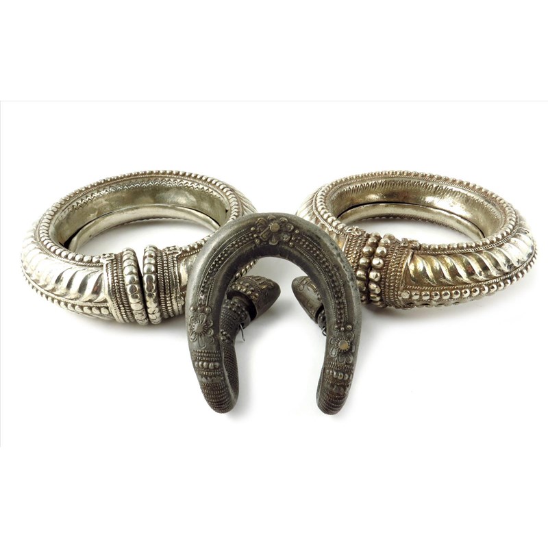 A silvered armlet, possibly Kenyan, with floral and bead decoration and detachable terminals, 7.5cm high, and a pair of silver coloured metal hollow bracelets, 14.5cm diameter. (3)